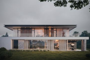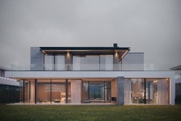 Современный двухэтажный коттедж площадью 430 кв.м с панорамными окнами и гаражом на два автомобиля