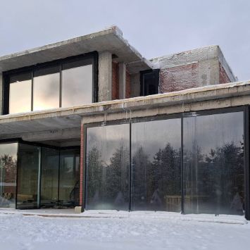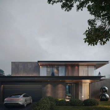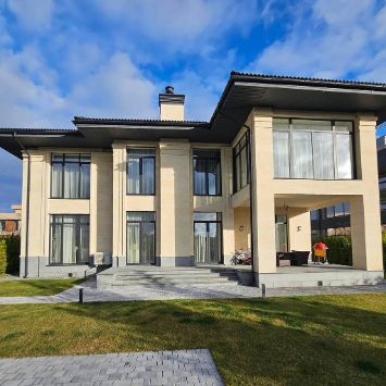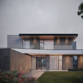 Первый этаж оборудован общими зонами и всем, что нужно для комфорта. При входе — холл, гардеробная, кабинет и гостевой санузел. Пройдя дальше, вы попадаете в просторное и светлое помещение, в котором соединились гостиная, кухня и столовая. За счет панорамных окон и высоких потолков пространство кажется очень светлым и уютным.
