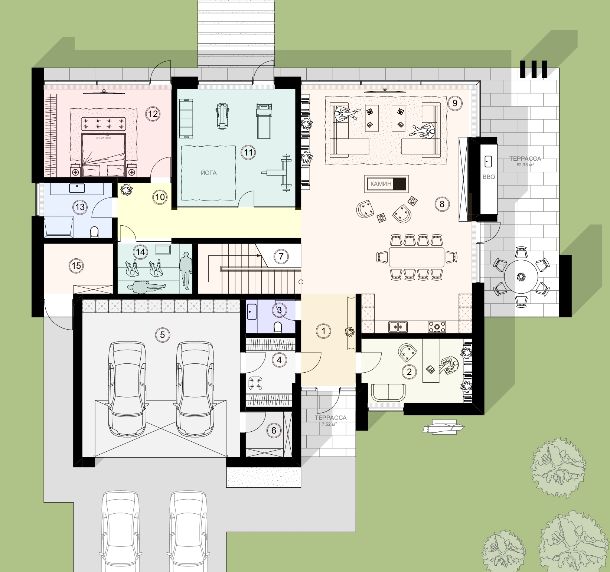 Дом находится на участке 15 соток, занимает всю его переднюю часть и делит территорию на 2 зоны: придомовую и дворовую. Парадная часть предусматривает входную группу с озелененной и благоустроенной территорией, парковку. Дворовая или приватная территория занимают треть участка. Вдали от посторонних глаз здесь можно разместить зону для барбекю, бассейн, летнюю кухню или другие постройки.