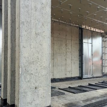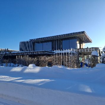 Дом органично вписывается в ландшафт за счет облицовочных материалов с натуральной текстурой. Это крупноформатный керамогранит и алюмокомпозитные панели под бетон, мрамор и кортен.