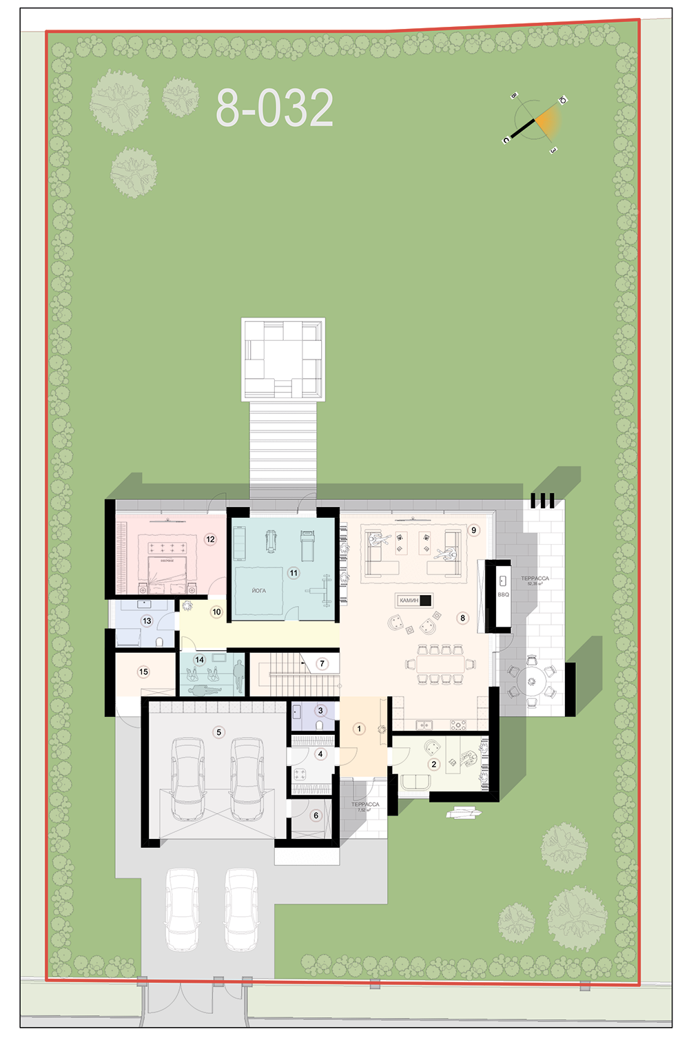 Дом находится на участке 15,45 соток, занимает всю его переднюю часть и делит территорию на две зоны: придомовую и дворовую. Парадная часть предусматривает входную группу с озелененной и благоустроенной территорией, парковку. Дворовая или приватная территория занимают треть участка. Вдали от посторонних глаз здесь можно разместить зону для барбекю, бассейн, летнюю кухню или другие постройки.