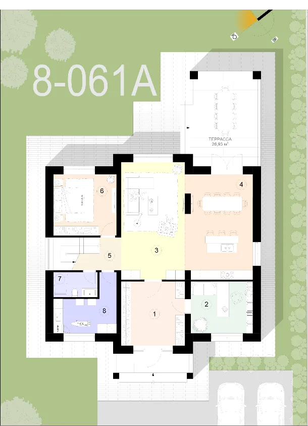 Дом размещен в районе первой трети участка и делит его на 2 зоны: придомовую и дворовую. Парадная часть предусматривает входную группу с озелененной и благоустроенной территорией, парковку. Дворовая или приватная территория занимают треть участка. Вдали от посторонних глаз здесь можно разместить зону для барбекю, бассейн, летнюю кухню или другие постройки.