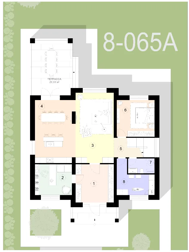 Дом занимает две трети участка и делит территорию на 2 зоны: придомовую и дворовую. Парадная часть предусматривает входную группу с озелененной и благоустроенной территорией, парковку. Дворовая или приватная территория занимают треть участка. Вдали от посторонних глаз здесь можно разместить зону для барбекю, бассейн, летнюю кухню или другие постройки.