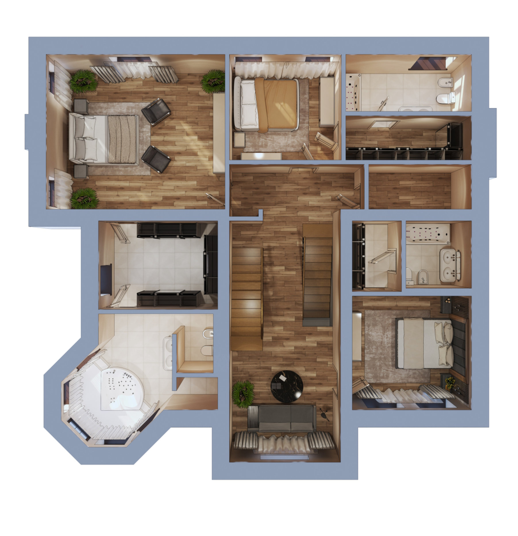 Интерьер и зонирование внутренних помещений проекта коттеджа «Босфор» продуманы до мелочей: большая мансарда, первый этаж с просторным холлом, гостиной, совмещенной со столовой и кухней, образующие единое пространство, удобный кабинет, гостевая спальня и санузел. Второй, жилой этаж проекта коттеджа «Босфор» — это будуар, три спальни и три отдельных санузла, объединенные не менее просторным холлом. В пристройке к коттеджу с отдельным входом: гараж, котельная и кладовая.