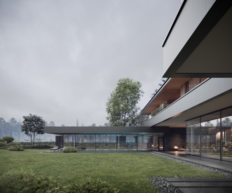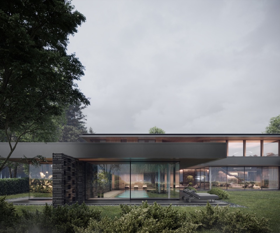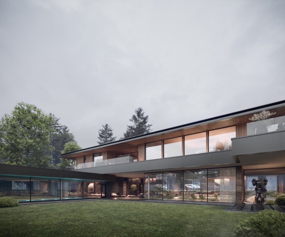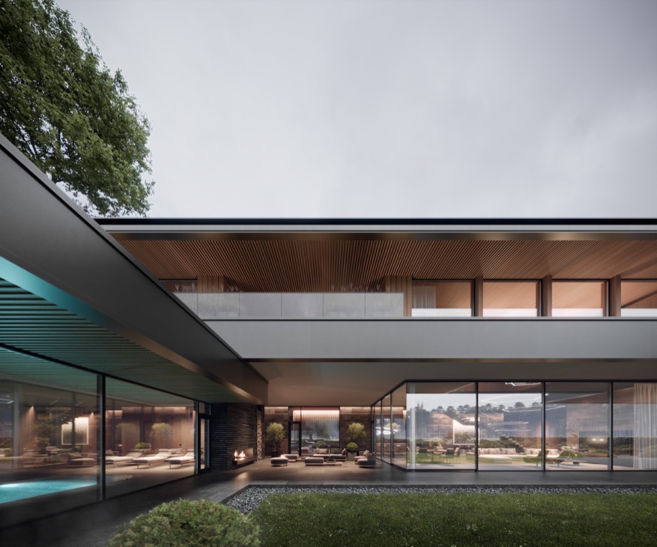 Заходя в дом, вы попадаете в большую прихожую, а затем в светлую и просторную гостиную-столовую с выходом на террасу и зону барбекю. Слева разместилось несколько гардеробных, гостевая спальня и помещение под библиотеку или кинотеатр. Также на этаже — кабинет, технические и бытовые помещения, СПА, бассейн.