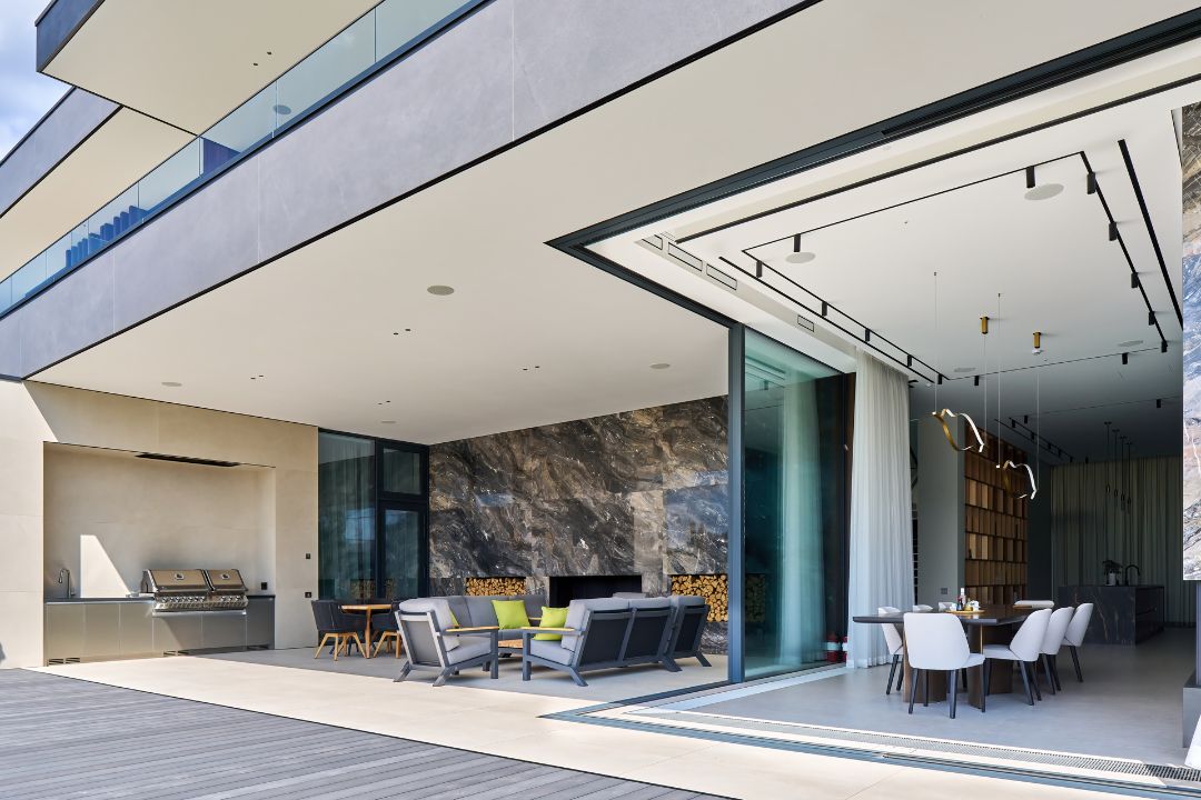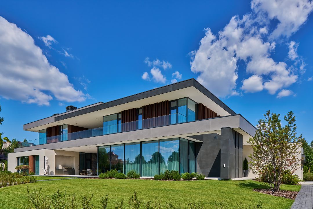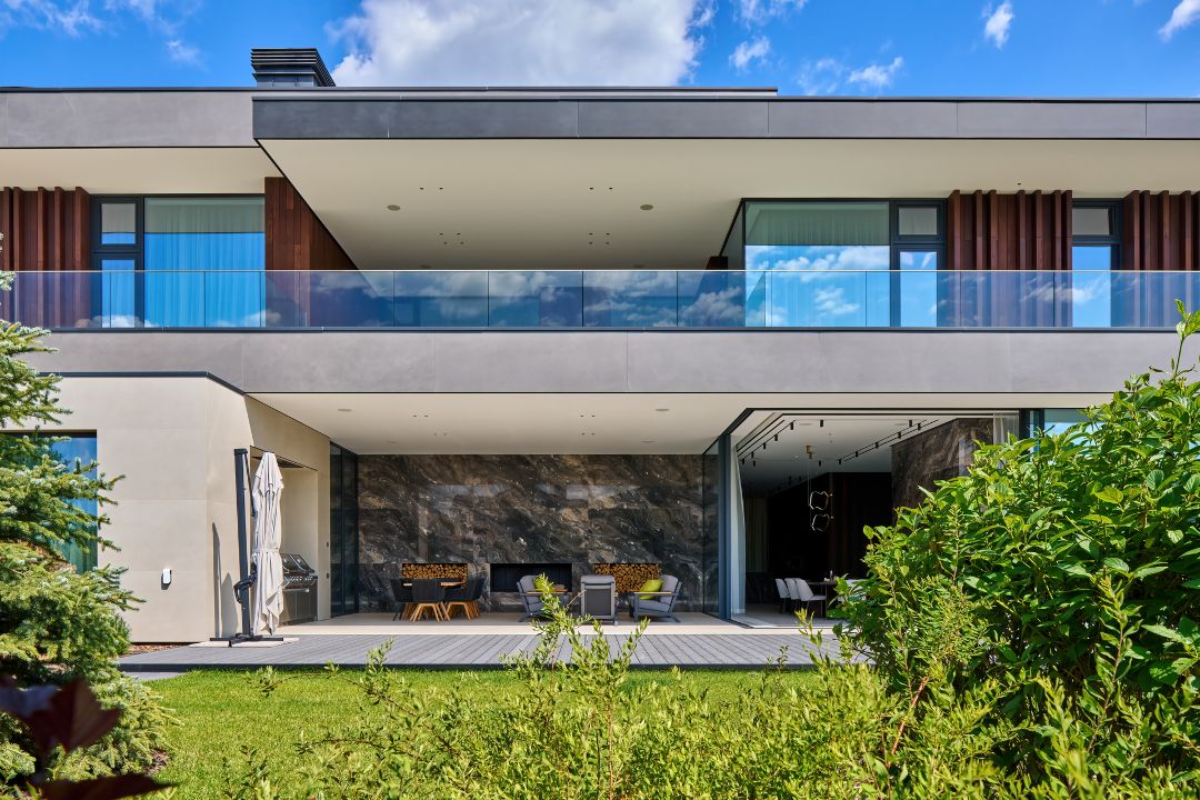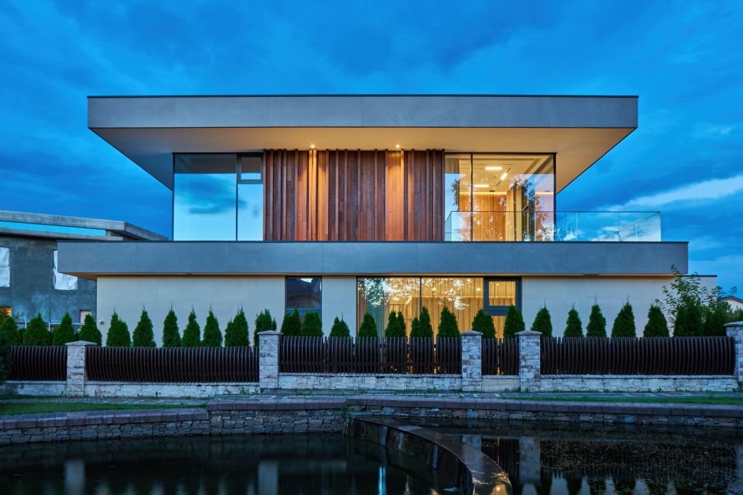 Первые ассоциации, которые приходят в голову, когда смотришь на этот проект. Здесь нет «кричащих» декоративных деталей, но фасад выделяется интересным сочетанием материалов: натурального мрамора, планкена, алюмокомпозитных панелей, крупноформатного керамогранита и большой площадью остекления. Через панорамные окна в дом будет попадать много солнечного света и «тепла», расширяя пространство и добавляя уют.