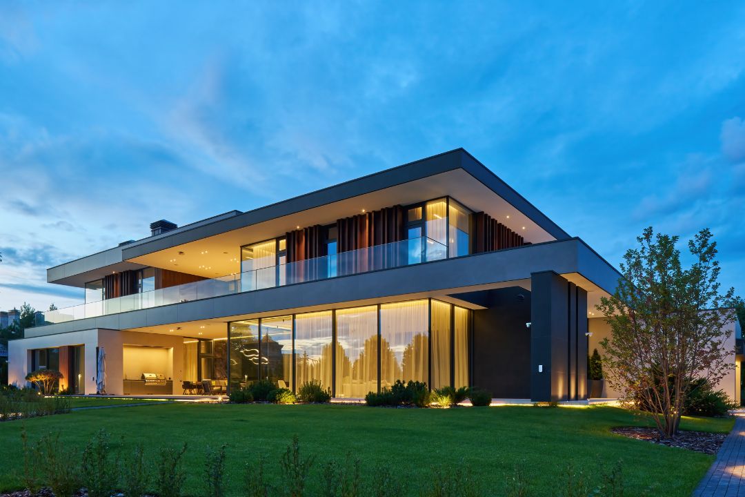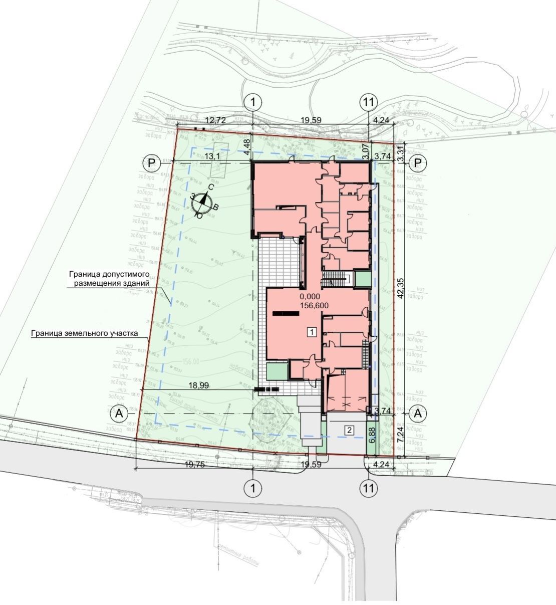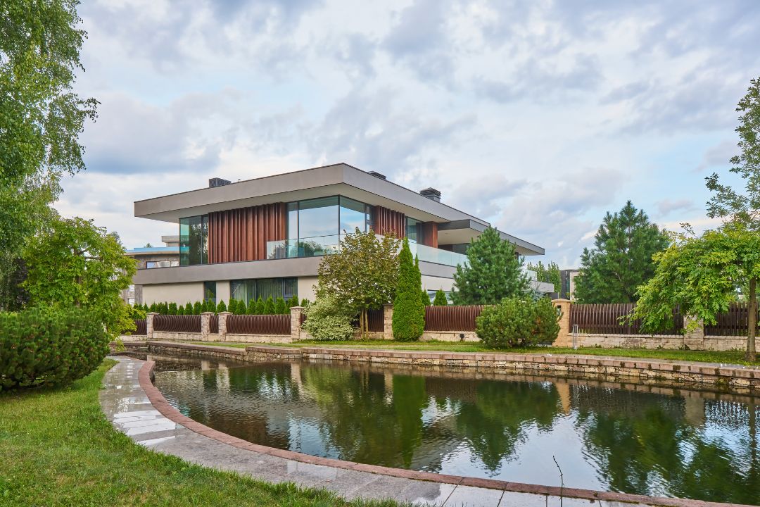 Дом удачно размещен в районе второй трети участка, который слева и справа граничит с 2-мя соседними участками, а с других сторон – с дорогой и рукотворным каналом в Миллениум Парке.