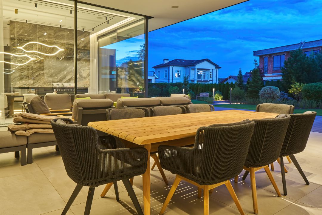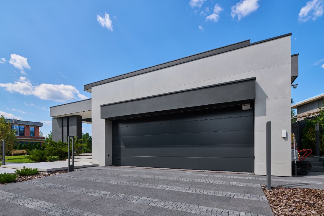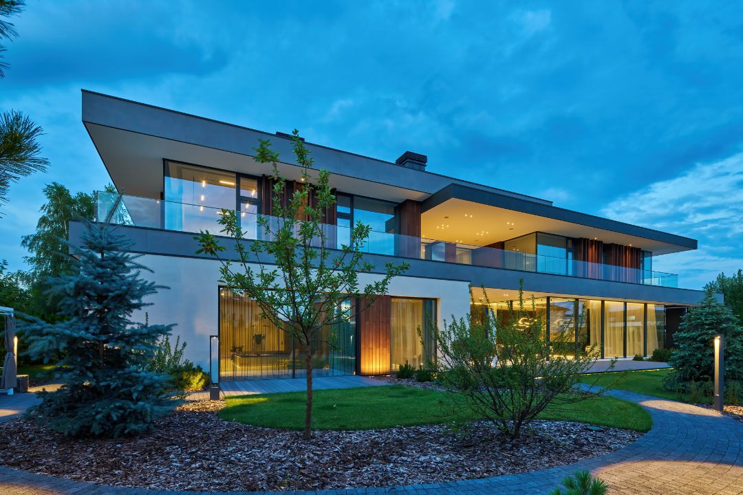 Парадная часть предусматривает входную группу с благоустроенной территорией, гараж с подъездной дорогой и место для парковки. Приватная территория занимает чуть больше трети участка и находится в районе террасы – она скрыта от дороги за зелеными насаждениями. Здесь – вдали от посторонних глаз можно разместить какие-то постройки, бассейн, оранжерею, благоустроить территорию.