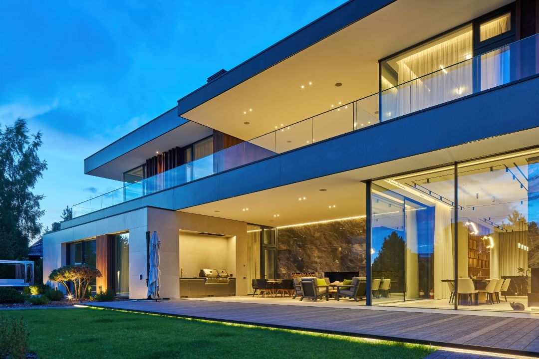 В планировке все продумано до мелочей. Технические помещения, гардеробная сезонной одежды, гараж – удобно размещены на цокольном этаже. Здесь же кинотеатр и игровая зона. На двух жилых этажах есть все для комфортной загородной жизни: большая гостиная со столовой зоной, кабинет, SPA с комнатой отдыха, баня с топочной, 5 спален, гардеробные, терраса почти 100 кв.м. Предусмотрены комнаты для персонала, рабочая кухня и помещение для собаки.