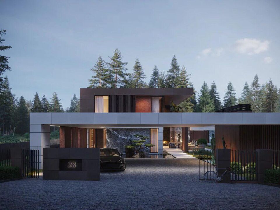 Дом спроектирован в форме буквы П, организуя скрытый от посторонних глаз уютный внутренний двор. Он включает отдельно стоящий хозяйственный блок на 185,5 кв.м., в котором предусмотрены помещения для охраны и персонала. Все постройки выполнены в едином стиле, а в облицовке отражены актуальные тренды загородной недвижимости: ультратонкий крупноформатный керамогранит, «тепло» деревянного планкена и брутальность природного камня.