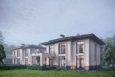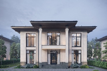 Это современный двухэтажный коттедж в стиле Райта с крытой террасой, эксплуатируемой кровлей и отдельно стоящим гаражом на 2 автомобиля. Характерная особенность дома — широкие свесы крыши и большие панорамные окна, наполняющие каждую комнату естественным светом.