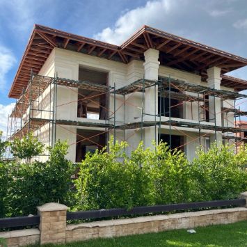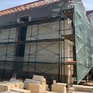 За это время мы успели выполнить монтаж перемычек и плит перекрытия 1-го этажа, закончили кладку стен 2-го этажа из крупноформатных блоков Монарх, уложили плиты перекрытия 2-го этажа, начали кладку перегородок и уже наносим набрызг под штукатурку. Используем легкую смесь Knauf Adgesiv. Она снижает впитываемость основания и создает шероховатую высокадгезионную поверхность.