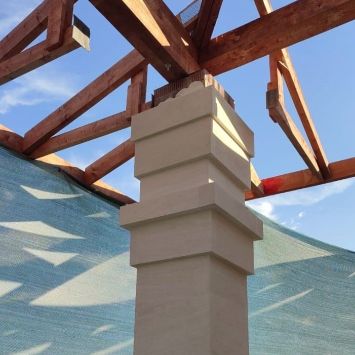 Другая бригада занимается устройством стропильной конструкции и обрешетки из бруса хвойных пород. Все деревянные элементы обрабатываем огне-био-защитным раствором Неомид-450. Он делает древесину устойчивой к воспламенению и пагубному воздействию влаги.