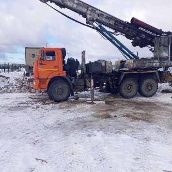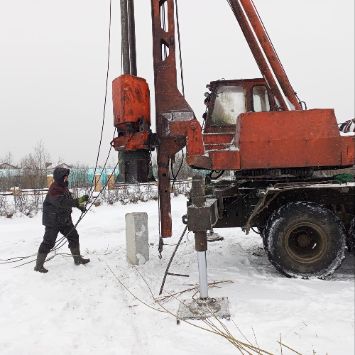 В основе этого коттеджа железобетонный свайный фундамент с монолитным утепленным ростверком. Мы уже подготовили котлован и сделали разметку, сейчас на объекте идет забивка 6-метровых свай квадратного сечения 30*30 см. По проекту их 61 шт., каждая выдерживает до 50 тонн. Их задача — усилить грунт и равномерно распределить нагрузку, обеспечив будущему дому максимальную устойчивость и надежность. Все работы контролируют геодезисты.