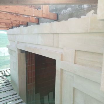 Мы уже оштукатурили фасад и заканчиваем облицовку плиткой из натурального Дагестанского песчаника. Приклеиваем ее на клей Perfekta «Хардфикс». Он устойчив к сползанию, обладает высокой прочностью и подходит для любых оснований.