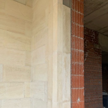 Мы уже оштукатурили фасад. Для набрызга использовали легкую смесь Knauf Adgesiv, а для основного выравнивающего слоя — штукатурку Perfekta. Сейчас облицовываем фасад плиткой из натурального Дагестанского песчаника. Приклеиваем ее на клей Perfekta «Хардфикс». Он устойчив к сползанию, обладает высокой прочностью и подходит для любых оснований.