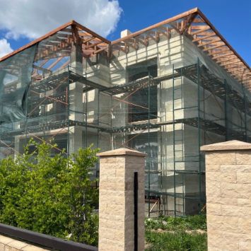 Это дом по проекту Марсель, который мы начали строить весной 2024 года. На днях закончили облицовку фасада натуральным камнем. Все тщательно зашлифовали, чтобы поверхность была более однородной и устойчивой к загрязнениям. Полированный камень прост в уходе и легко моется.