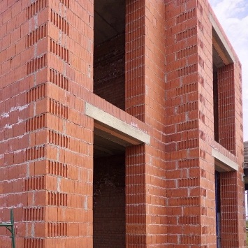 За 2 недели мы закончили кирпичную кладку цоколя и возвели наружные стены 1-го этажа до проектной отметки. Кладка выполнялась из крупноформатных блоков 14,3NF «Гжельского кирпичного завода» на «теплый» раствор Perfekta. Дополнительно мы укладывали в растворные швы базальтовую сетку Porotherm с шагом 2 ряда по высоте. Она укрепила кладку в углах, где стыкуются блоки. В результате стены получились прочными и надежными.