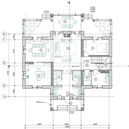 Для отделки фасада можно выбрать один из двух вариантов: натуральный светлый камень или декоративный кирпич. Для облицовки цоколя предусмотрен темный гранит, и в тон ему — фальцевая кровля.
