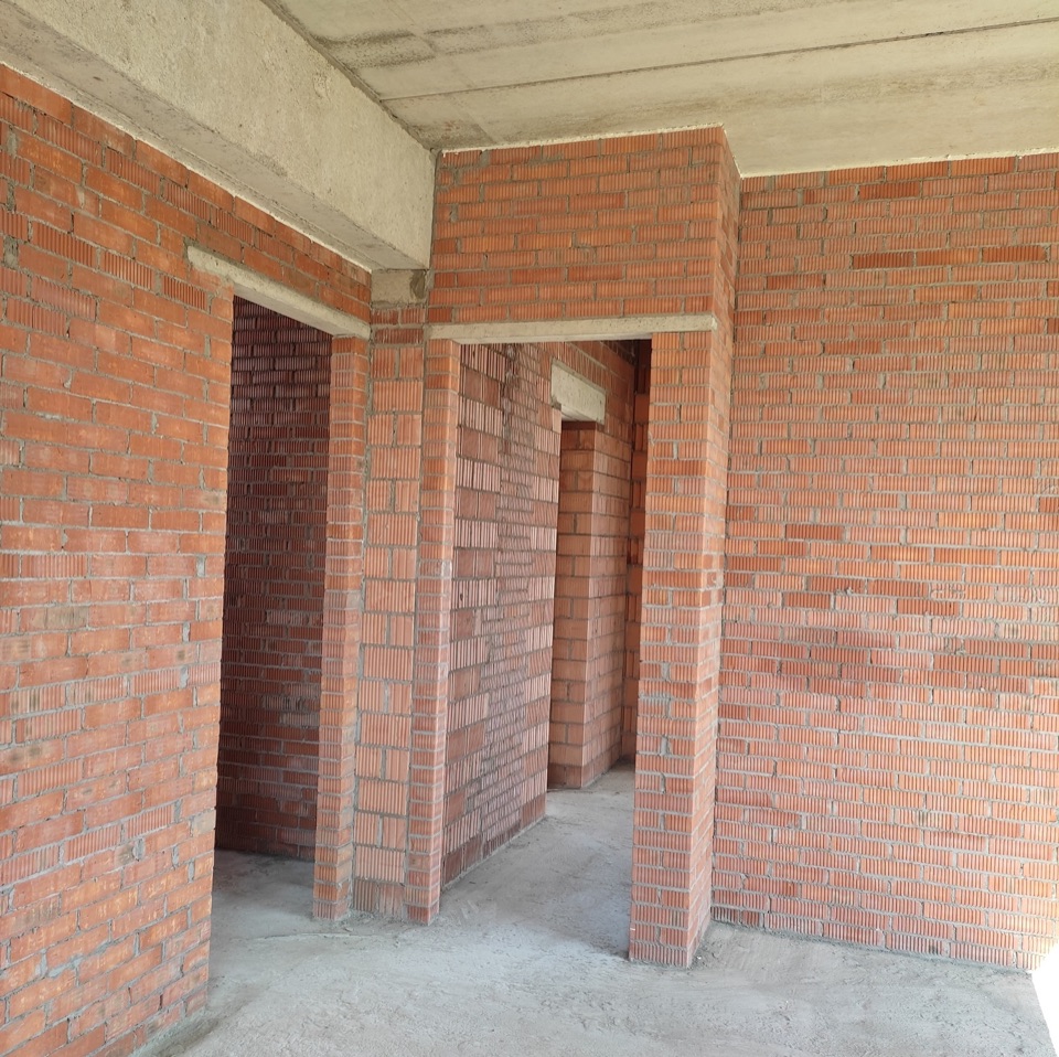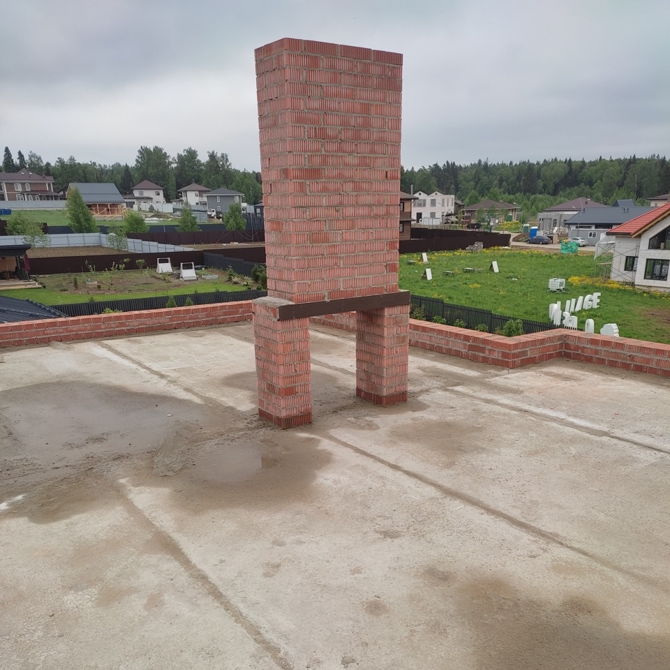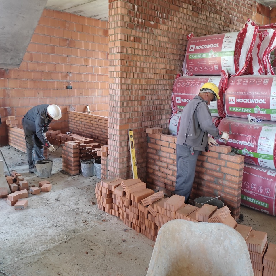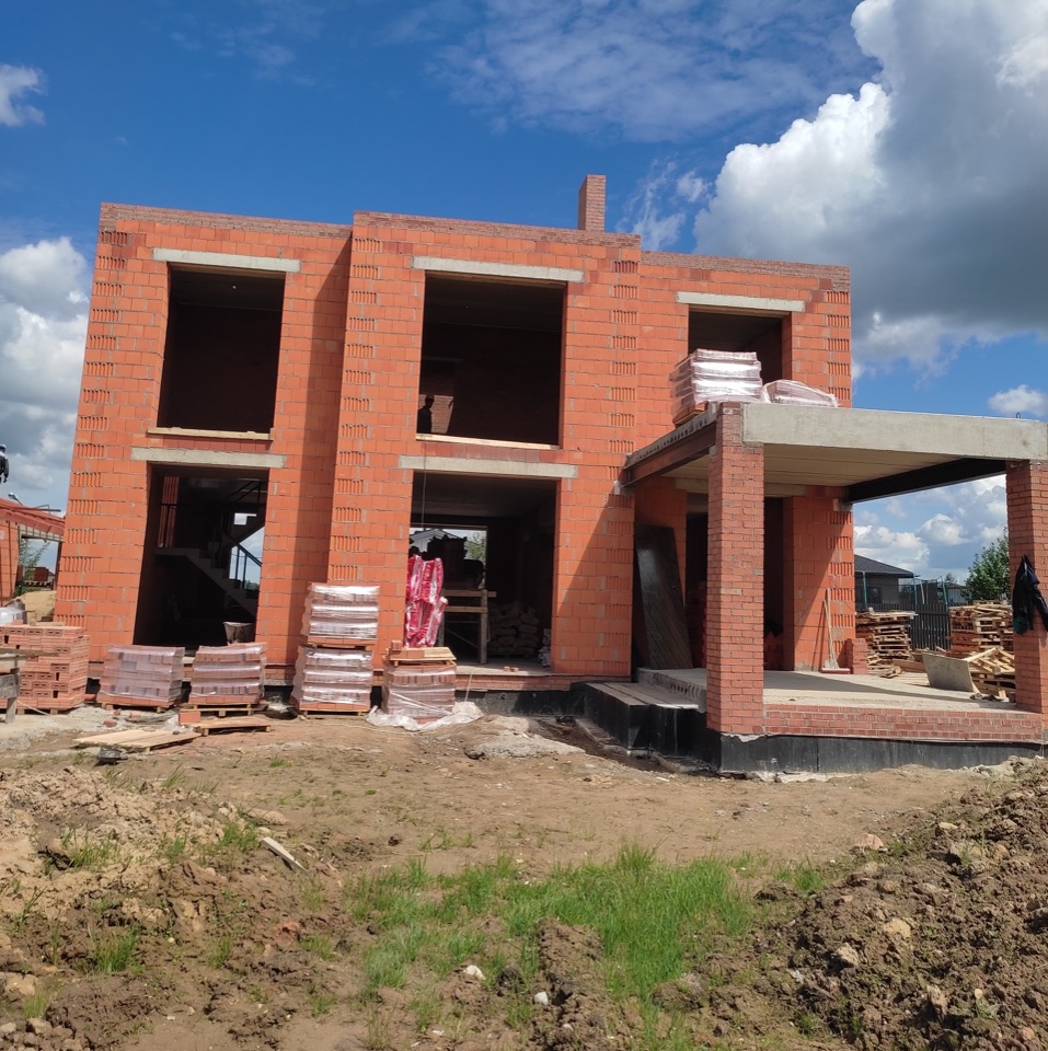 Параллельно идут кладочные работы в основном доме. Здесь мы возводим вентиляционные шахты и перегородки из полнотелого красного кирпича М150 Каширского завода на «Универсальную смесь М-150» Perfekta. Другая бригада рабочих выполняет кладку под мауэрлат крыши дома. В ближайшее время начнем кровельные работы.