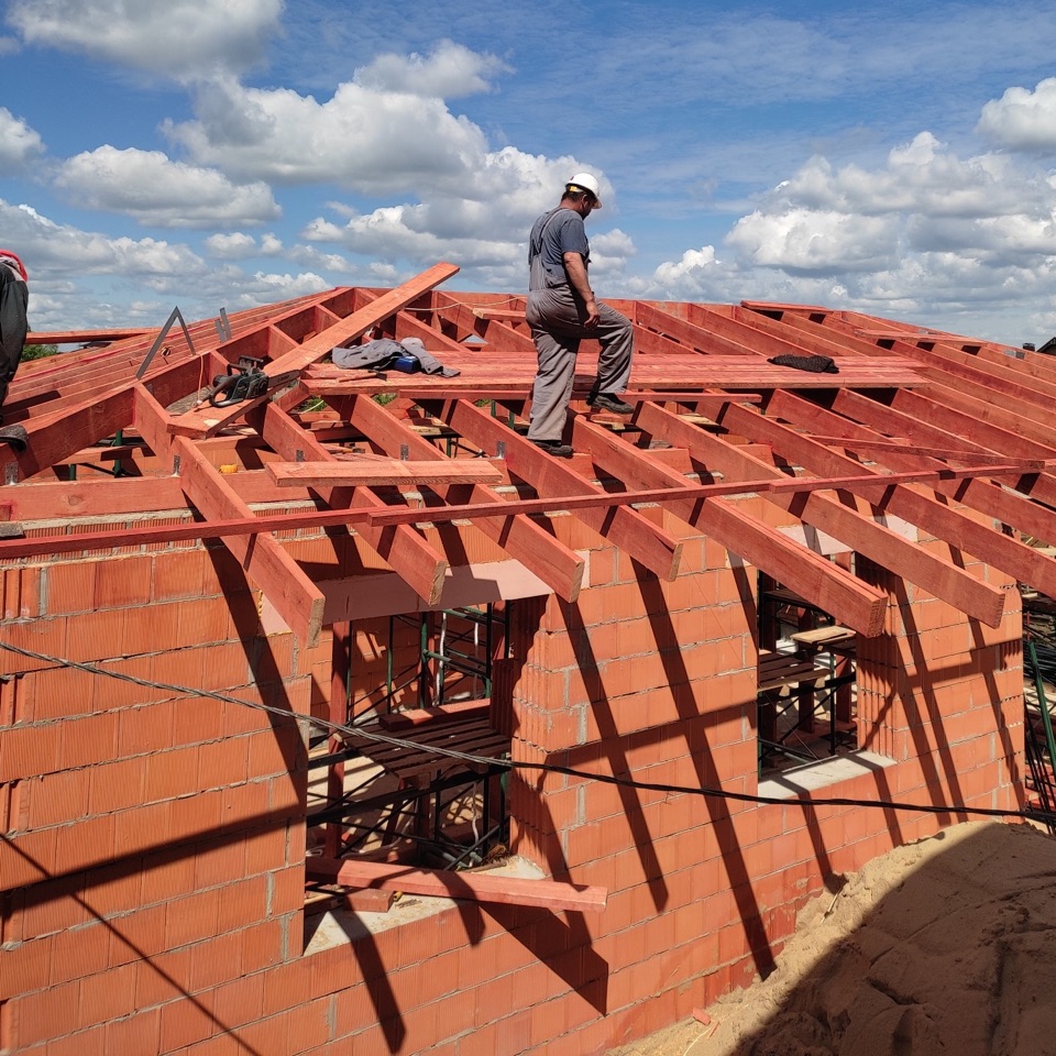 В коттеджном поселке «Тихие Зори» продолжается строительство двухэтажного дома в стиле Райта с террасой и отдельно стоящим гаражом на 2 автомобиля. Этот дом готовится для выставки Open Village 2022, которая пройдет здесь с 16 по 31 июля. С нашего последнего фотоотчета прошла неделя. За это время мы закончили кладку перегородок в основном доме и начали устройство стропильной конструкции крыши гаража. По проекту кровля обеих построек будет выполнена из цементно-песчаной черепицы Braas Таунус в темно-коричневом цвете.