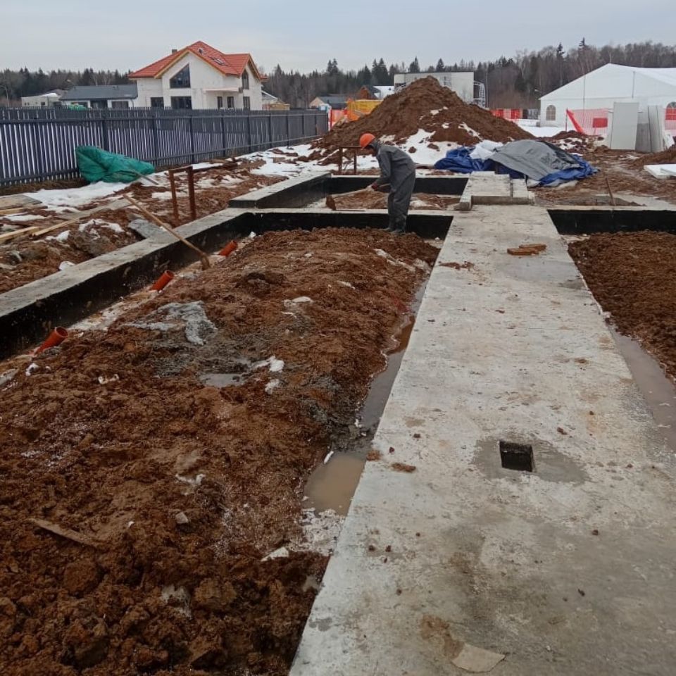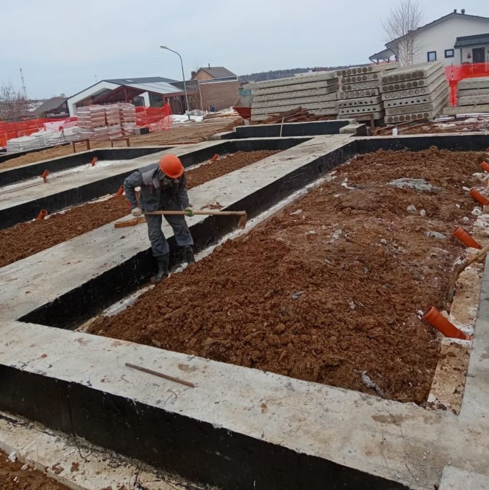 Следующим шагом стала уборка территории и обратная засыпка пазух. Она необходима, чтобы выровнять поверхность, обеспечить стойкость и прочность фундамента.