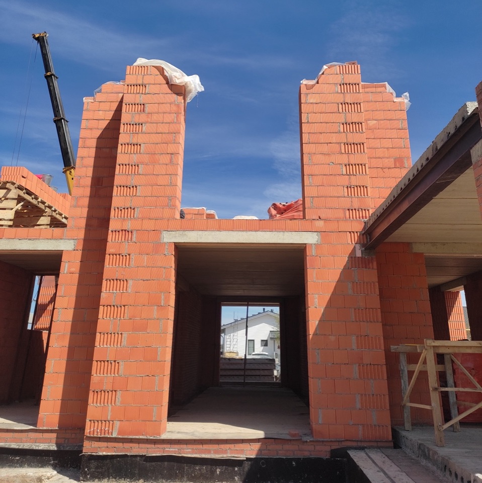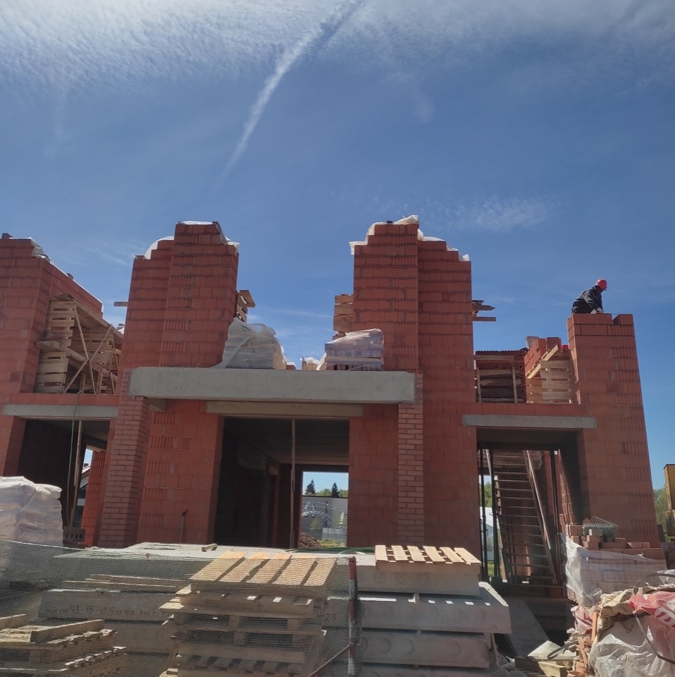 Кладка стен 2-го этажа выполняется с использованием армирующей сетки. Она не увеличивает несущую способность стен, но при этом укрепляет кладку в углах, где стыкуются блоки. Сейчас очертания дома уже начинают вырисовываться, но впереди еще много работы.
