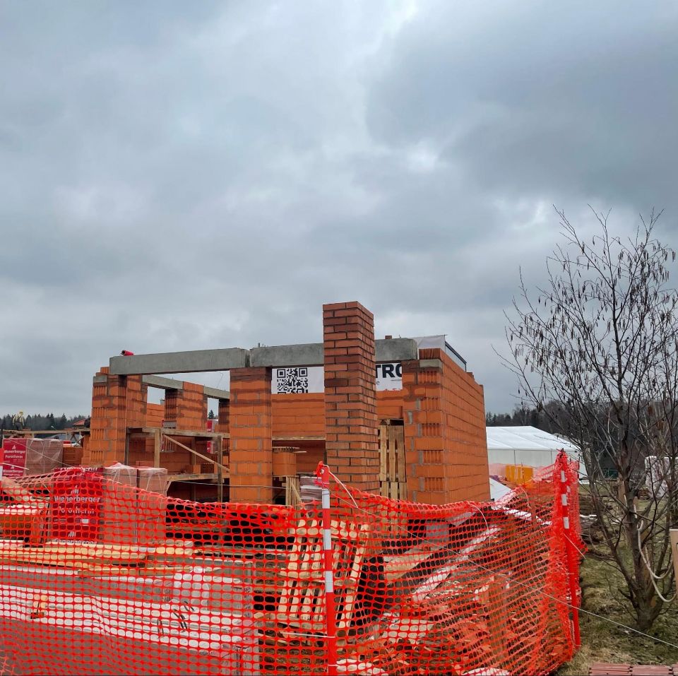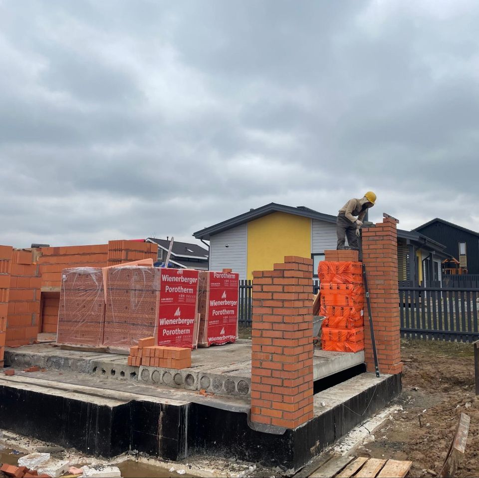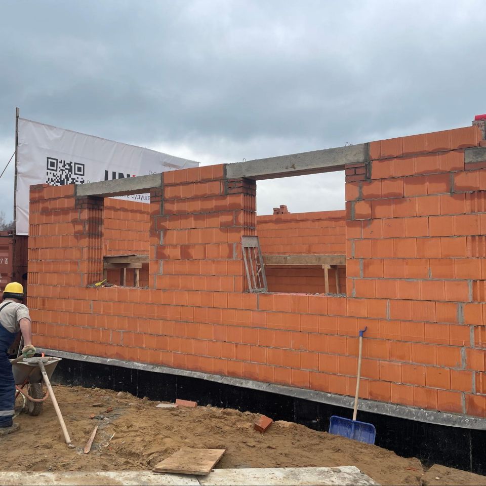 Доводя кладку до нужной проектной отметки, мы приступили к устройству оконных и дверных перемычек с помощью ЖБИ заводского изготовления. Плюс в том, что в отличие от использования монолитных перемычек, здесь не нужно ждать набора прочности. Можно продолжать работы по кладке практически в тот же день.