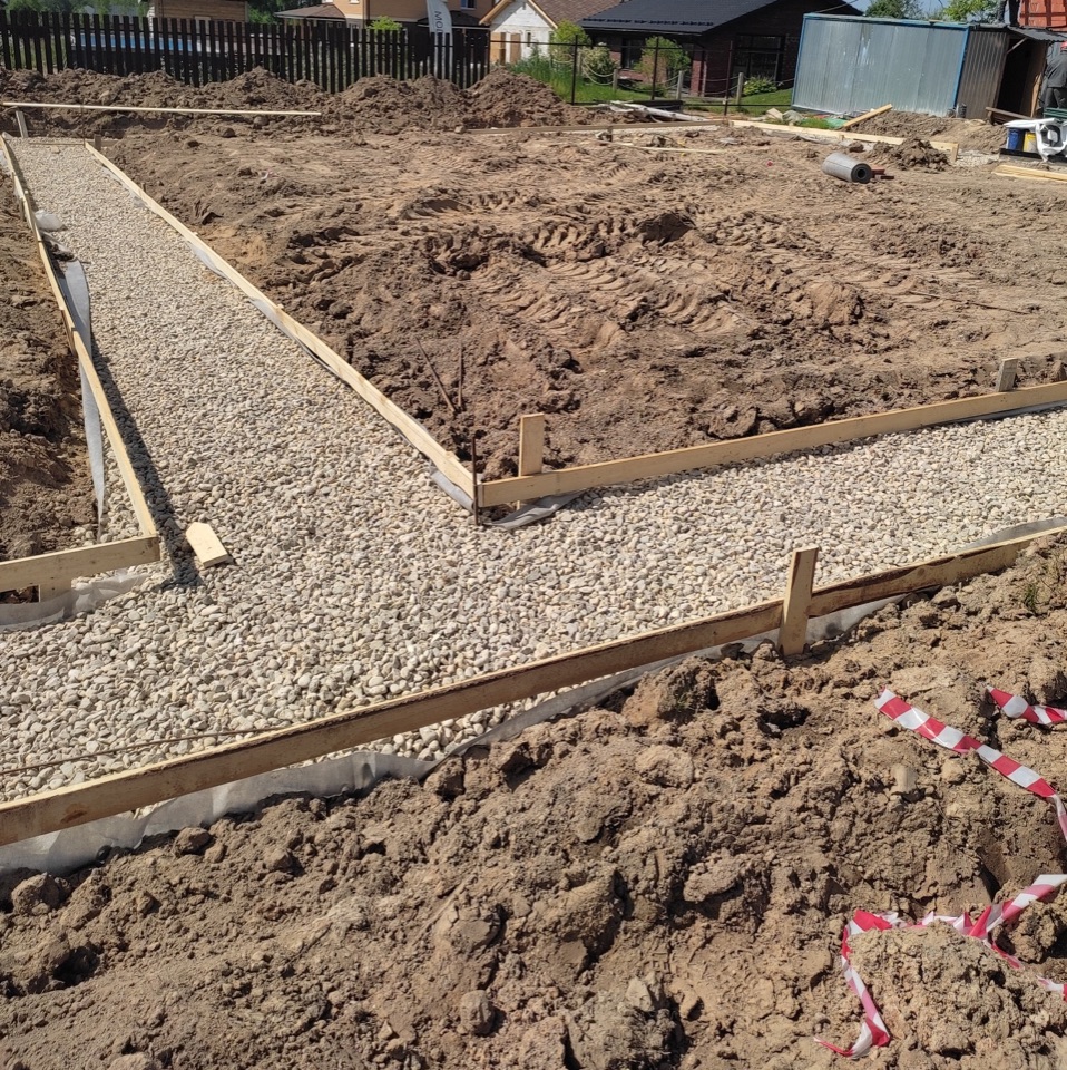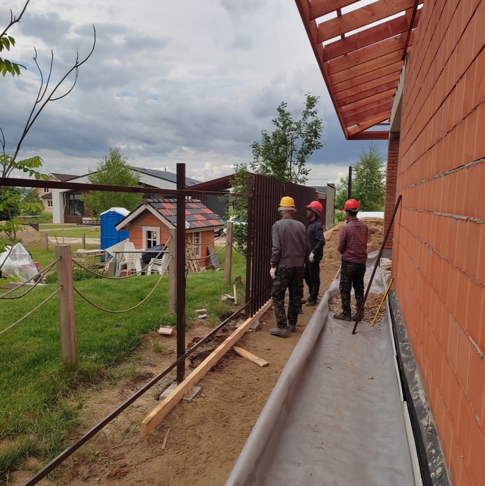 Мы продолжаем устройство забора и выполняем монтаж прямоугольного штакетника Grand Line из оцинкованной стали с полимерным покрытием. Параллельно идет демонтаж жилого городка и дорожных плит, устройство отмостки и пошаговых дорожек на участке. На этом объекте мы применяем технологию жесткой отмостки, которая состоит из слоя песка, геотекстиля, щебня и армированного бетона. Такой «пирог» защитит фундамент и цоколь от воздействия дождевой и талой воды.