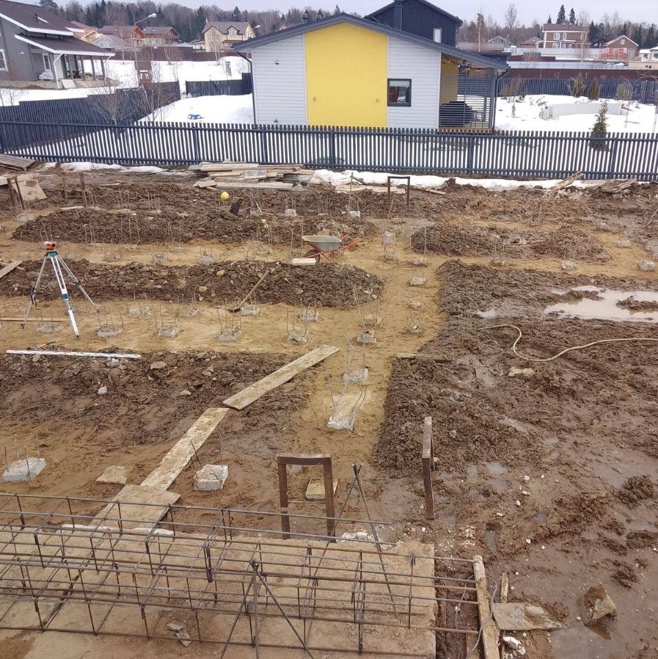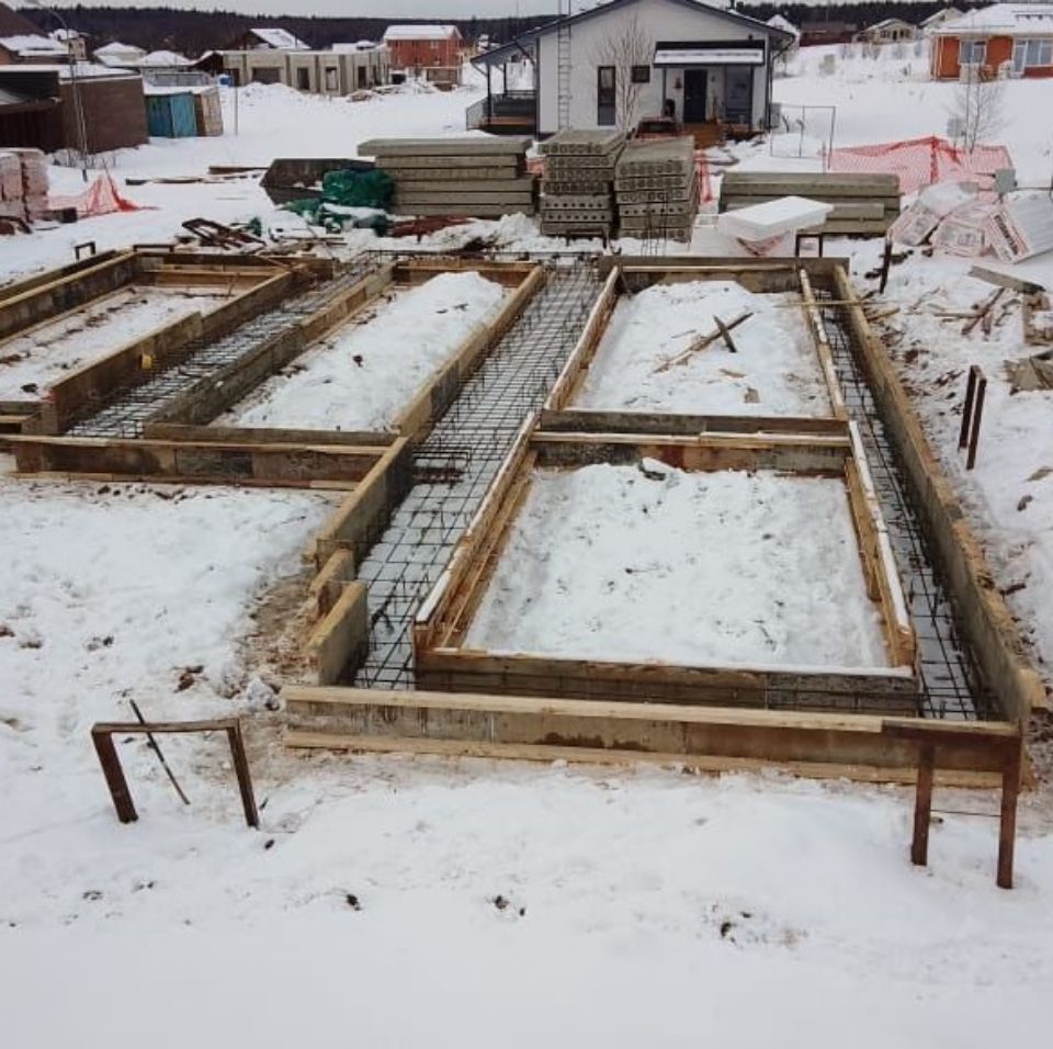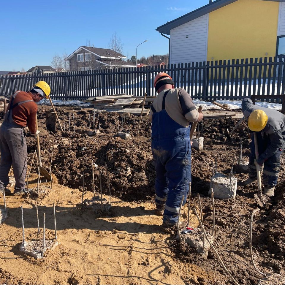 Всего нами было забито 94 сваи квадратного сечения С 60.30-6, у которых мы срубили оголовки и выровняли высоту, чтобы обеспечить правильное устройство будущего ростверка. Ростверк — это часть фундамента, которая объединяет оголовки свай и служит опорой для перекрытия и стен. Именно он принимает и распределяет нагрузку, передавая ее на сваи.
