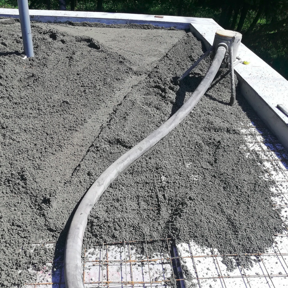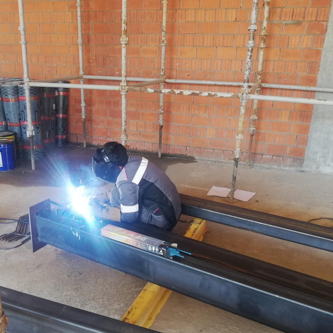 В проект основного дома были внесены изменения на уровне второго этажа, поэтому наша бригада оперативно начала изготовление 4-х стальных колонн. Такие опоры из профильной металлической трубы обладают высокой прочностью и надежностью в эксплуатации. Кроме того, их легко спрятать за облицовкой, поэтому они эстетично впишутся в любой дизайн. Для установки колонн на нужные позиции мы сделали монтажный проем. А чтобы усилить плиту перекрытия и увеличить эксплуатационные нагрузки, мы дополнительно нарезали 20-мм арматурные стержни.