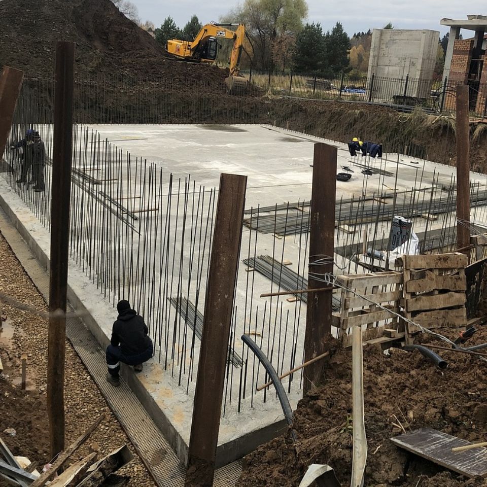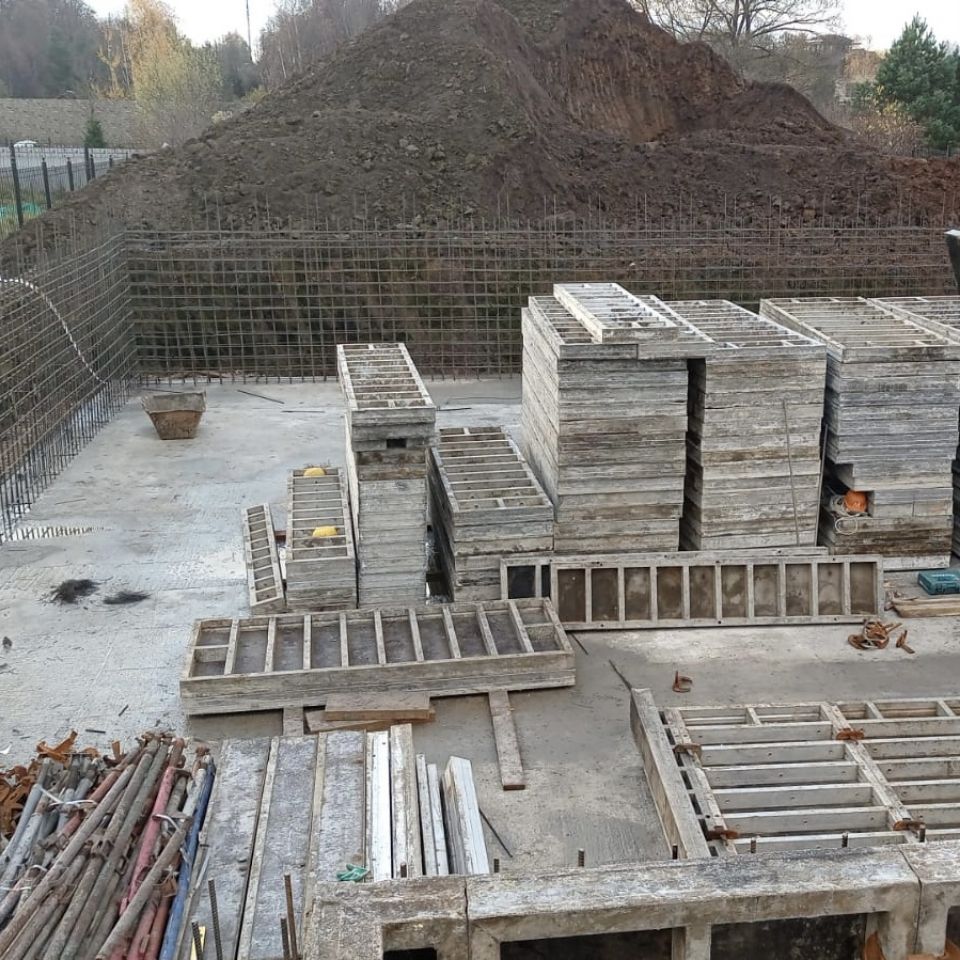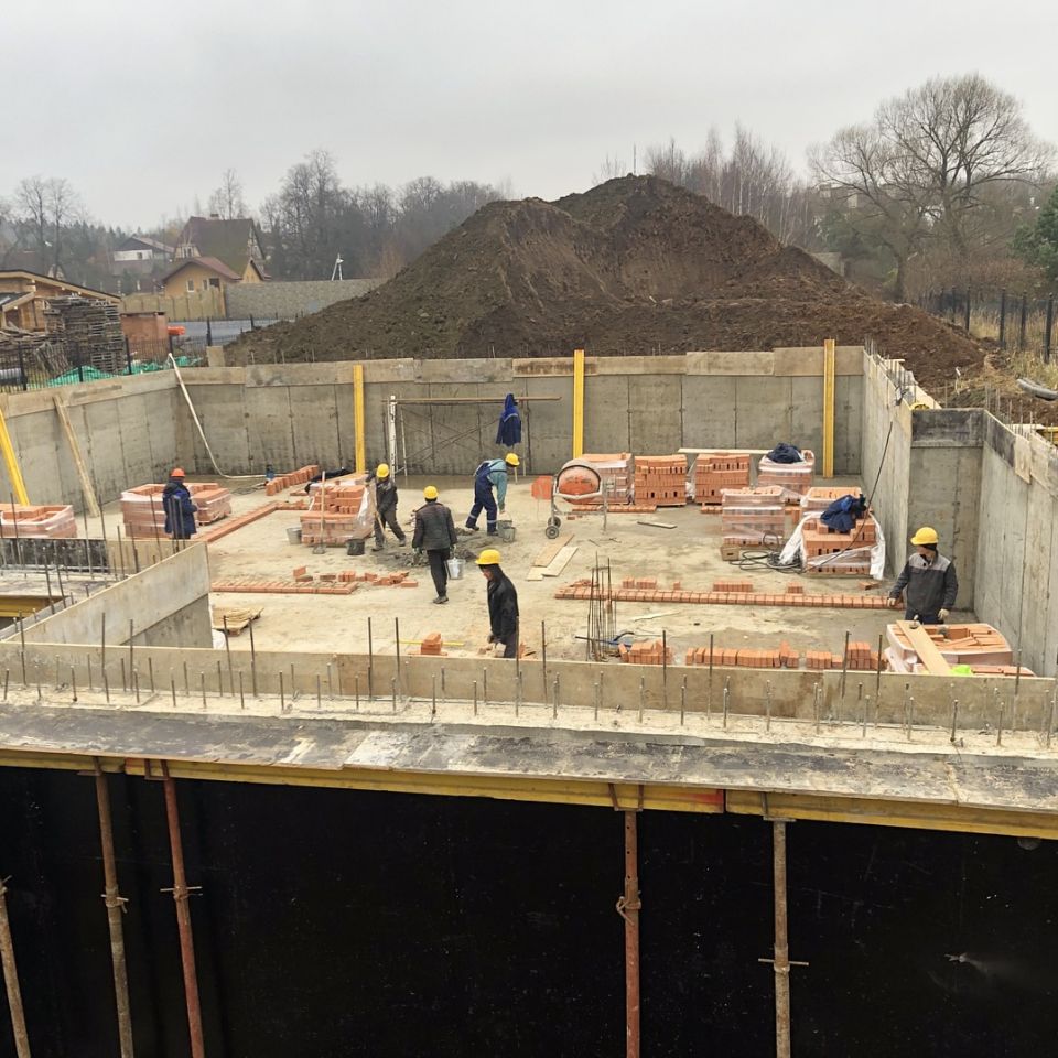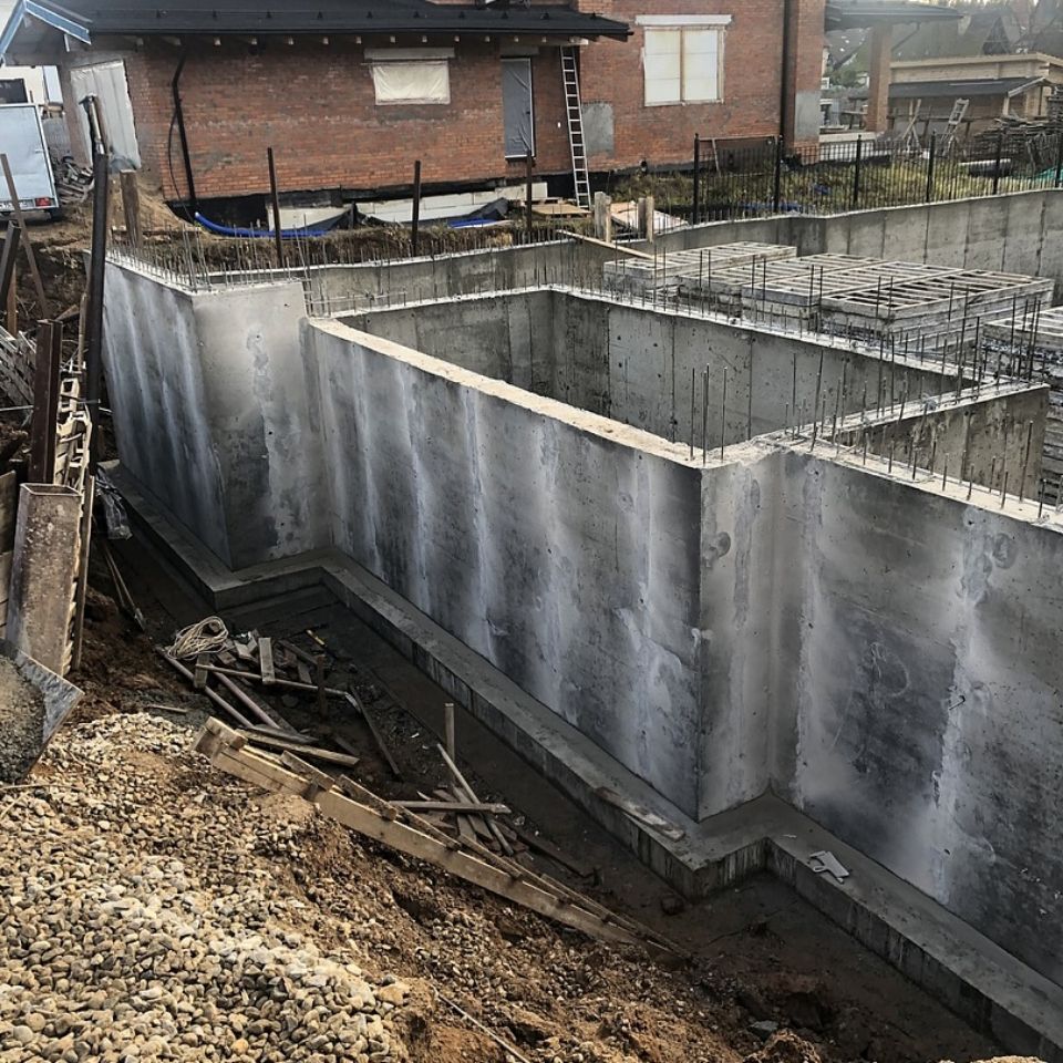 После того, как праймер высох, мы приступили к армированию выступа фундаментной стены и монтажу деревянной опалубки. Собранную опалубку мы залили бетоном М350 «Инком-бетон». Когда он набрал прочность, мы демонтировали опалубку, очистили наружные стены и верх подготовки от наплывов, и приступили к наплавлению рулонной гидроизоляции Техноэласт ЭПП «Технониколь». Она усиливает гидро- и теплоизоляционные свойства, обеспечивая абсолютную водонепроницаемость и термостойкость. Параллельно велась кладка перегородок подвала красным полнотелым кирпичом «Каширского кирпичного завода».