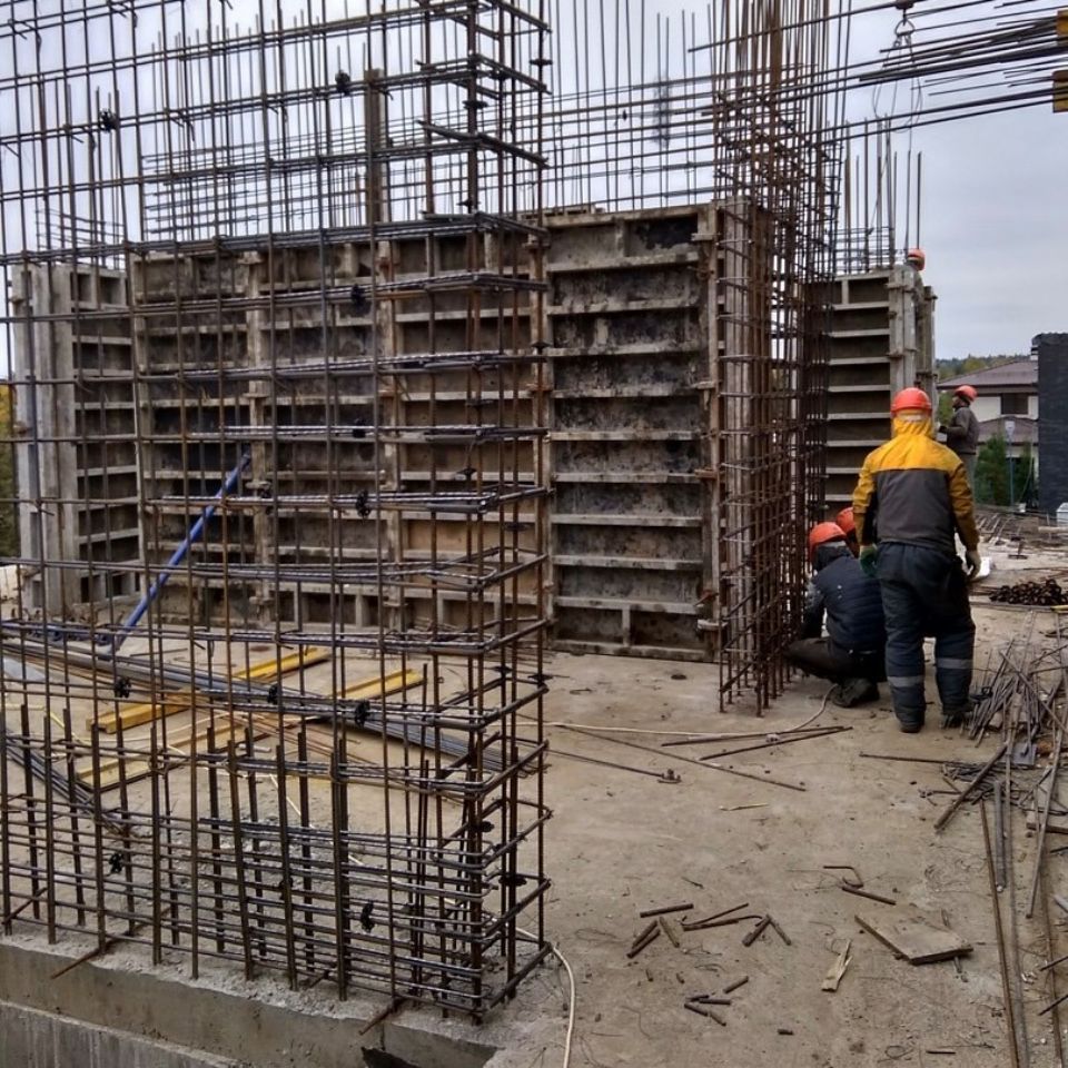 На первом этаже основного дома мы выложили перегородки из красного полнотелого кирпича М150. На втором этаже шло возведение монолитных стен. Для этого сначала собрали каркас, используя стальные прутья класса А500С/СП. Мы использовали два вида арматуры — прямую, устойчивую к коррозии, и ребристую, для более стойкого сцепления с раствором. Затем смонтировали опалубку и залили ее бетоном М-350 «Инком-Бетон». Когда он наберет нужную прочность, мы демонтируем опалубку.