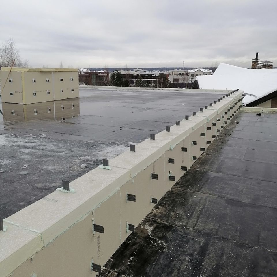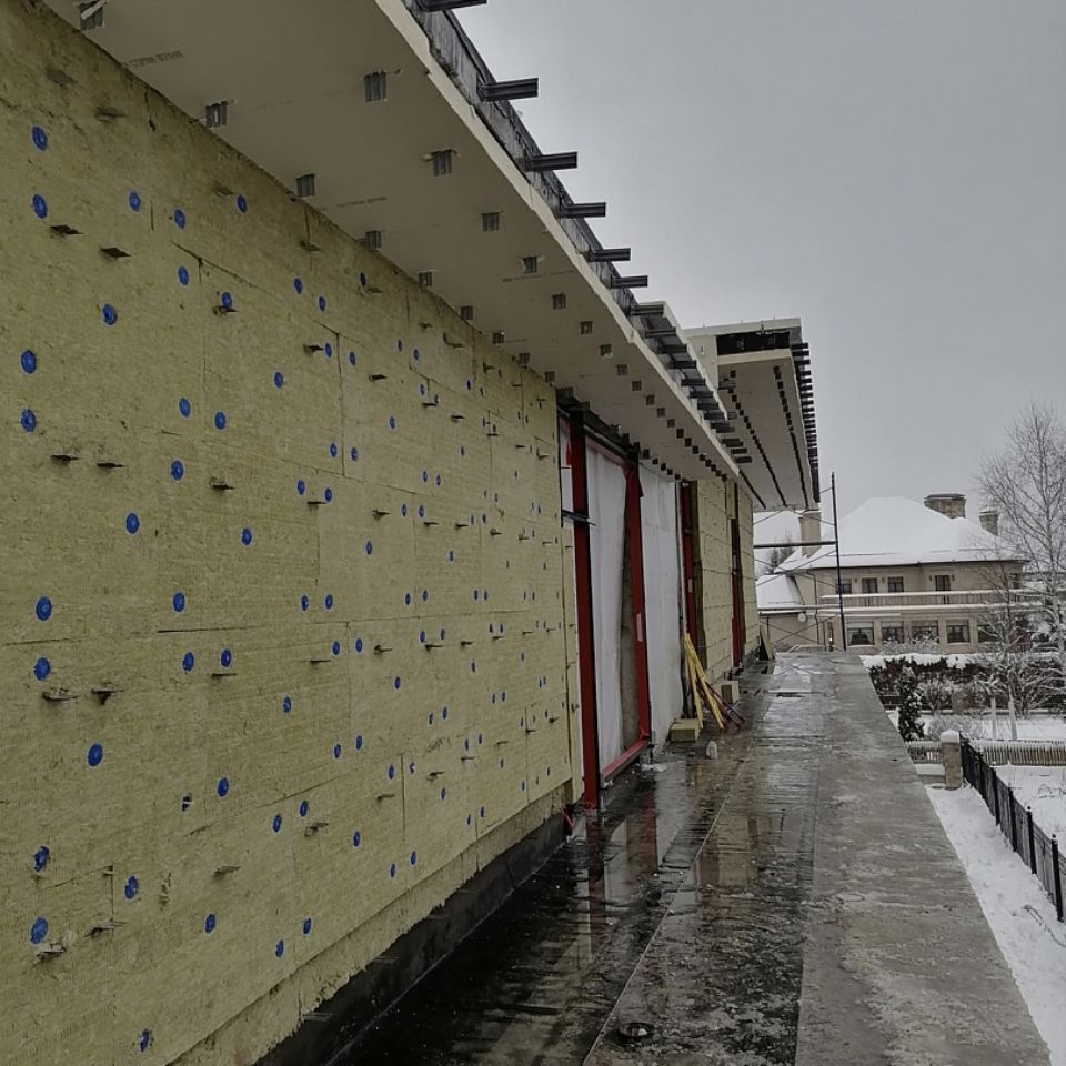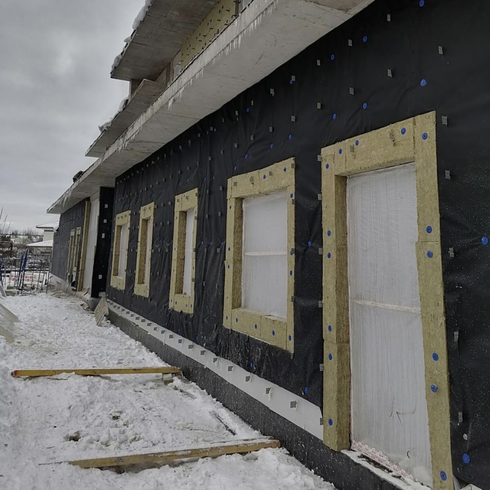 Мы продолжаем утеплять фасад виллы плитами из каменной ваты Венти Баттс «Rockwool». Цоколь и парапет дома утепляем теплоизоляционными плитами LOGICPIR PROF Технониколь. Поверх утеплителя укладываем ветрозащитную мембрану DELTA-FASSADE. Эта прочная и долговечная пленка, изготовленная по технологии двухслойного волокна, выдерживает давление талой воды и значительные перепады годовых температур.