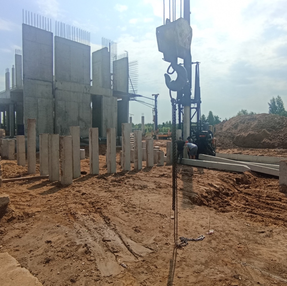 Забивка свай осуществляется 4-мя сваебойным установками, в том числе, техникой Стройматик. Эта высокопроизводительная установка способна забивать до 40 свай за 8-часовую рабочую смену. Она отличается высокой маневренностью и бесшумностью, оказывает минимальное динамическое воздействие на фундаменты окружающих построек.