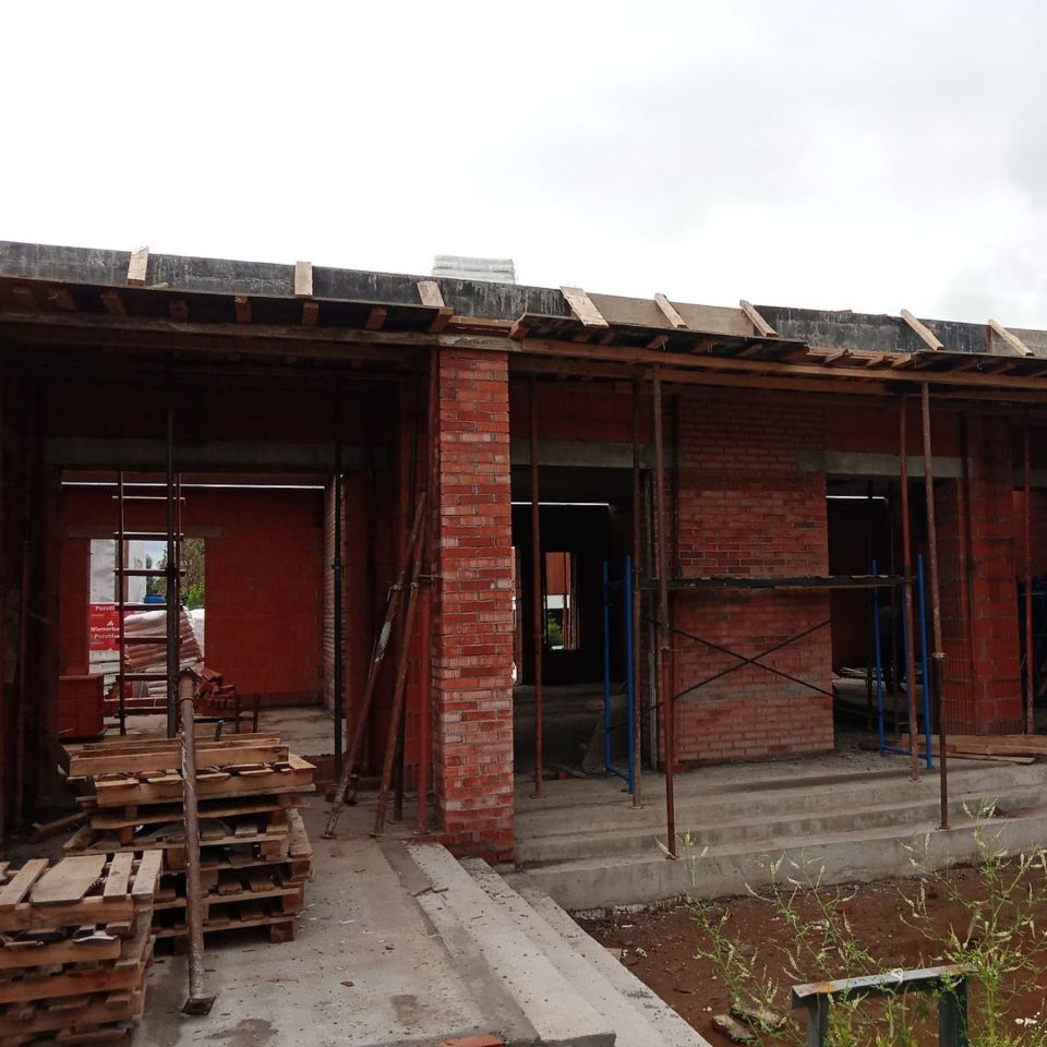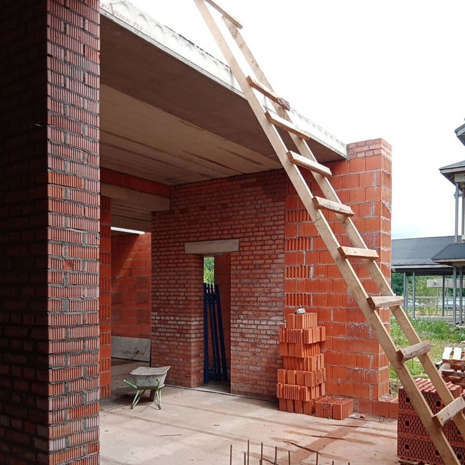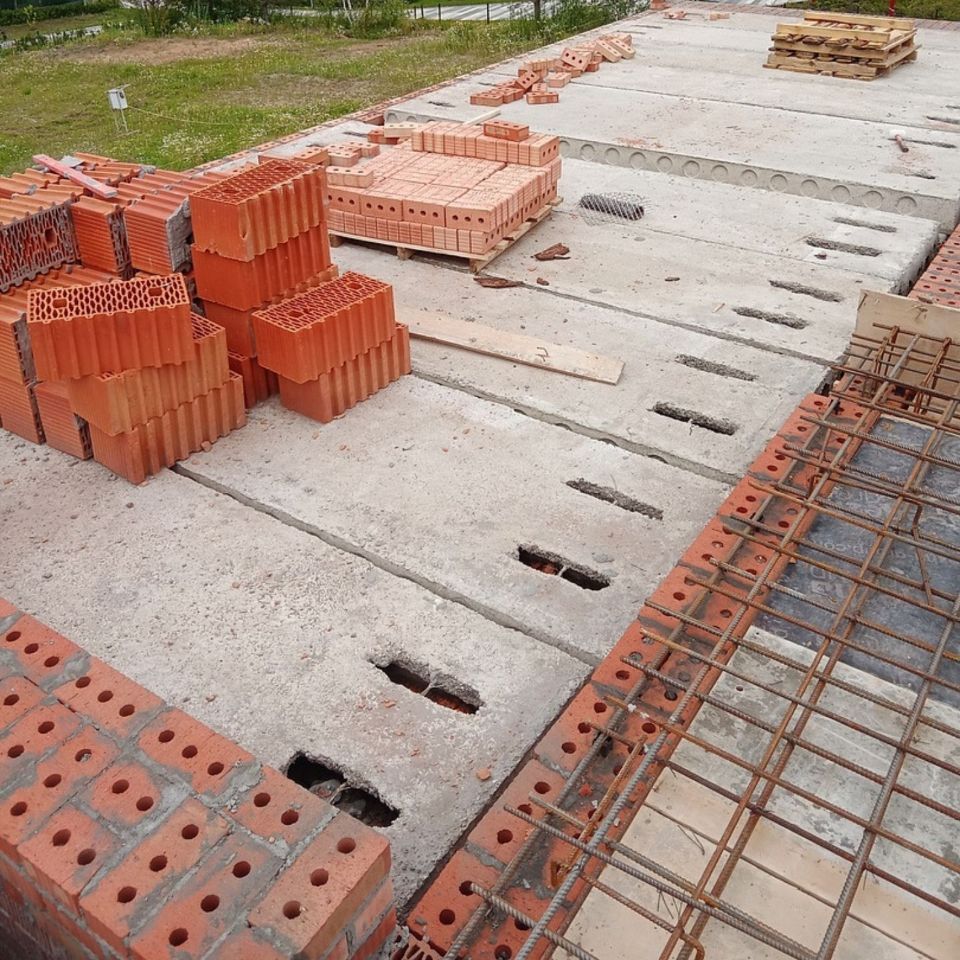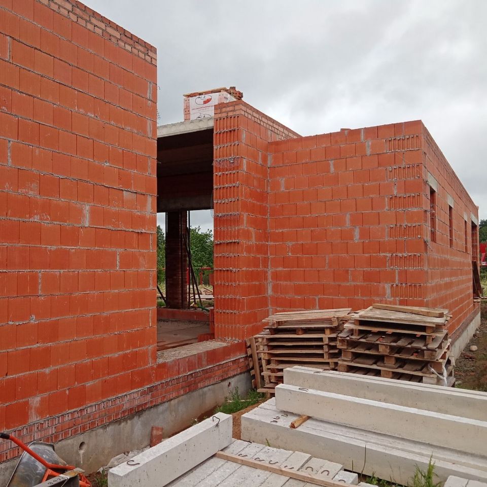 К сегодняшнему дню уже возведены стены первого этажа, уложены плиты перекрытия и мы приступили к кладке стен второго этажа. На этом этапе мы используем крупноформатные керамические блоки Porotherm 51 Wienerberger. Блоки имеют размеры 510х250х219мм — такой крупный формат и соединение паз-гребень значительно ускоряют темпы строительства.