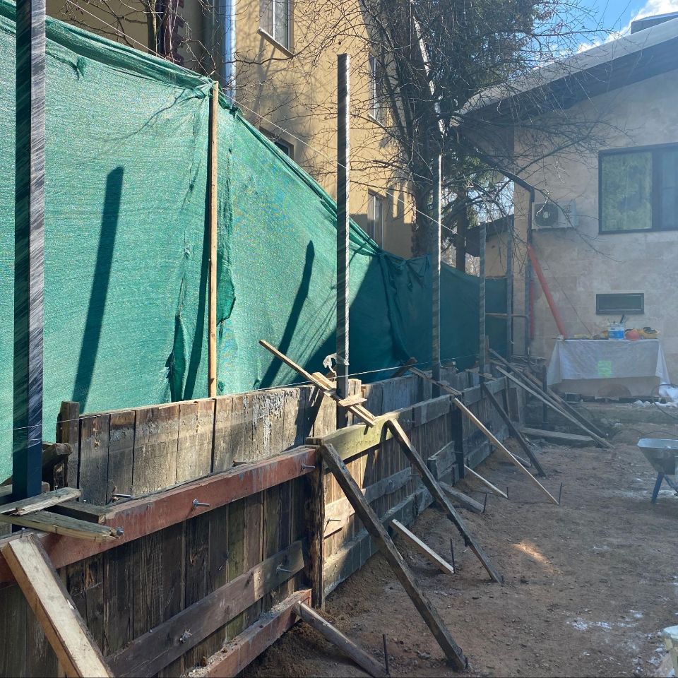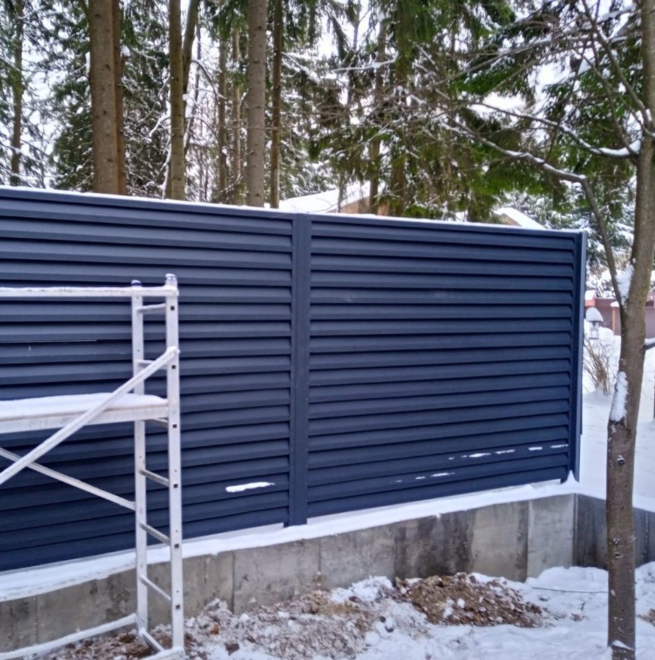 По проекту забор-жалюзи выполнен из самонесущего профиля Grand Line и закреплен на металлических направляющих и железобетонном ростверке. Для устройства ростверка на 2-х оставшихся сторонах ограждения мы использовали сертифицированную арматуру класса АI/AIII и 13 кубометров высококачественного бетона Инком-Бетон. Под ростверком мы предусмотрели демпферную подушку из пенопласта, уложив ее по всему периметру. Она обеспечит свободное расширение стяжки и целостность покрытия не будет нарушена.