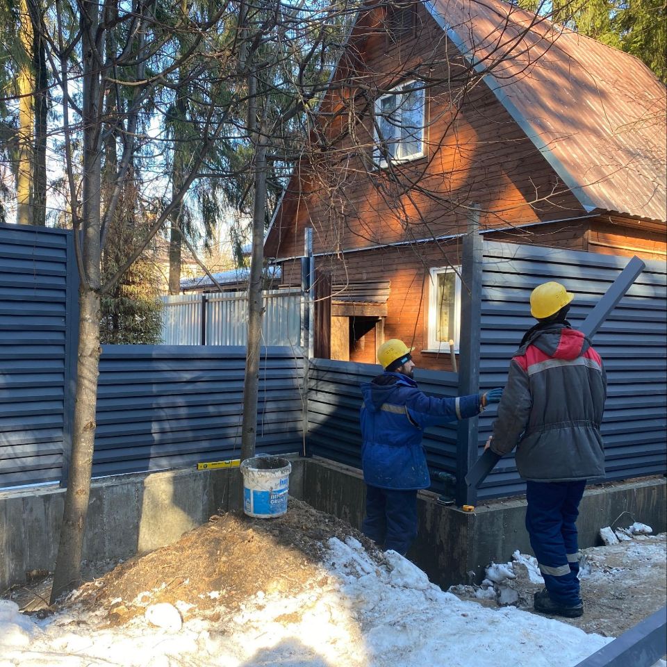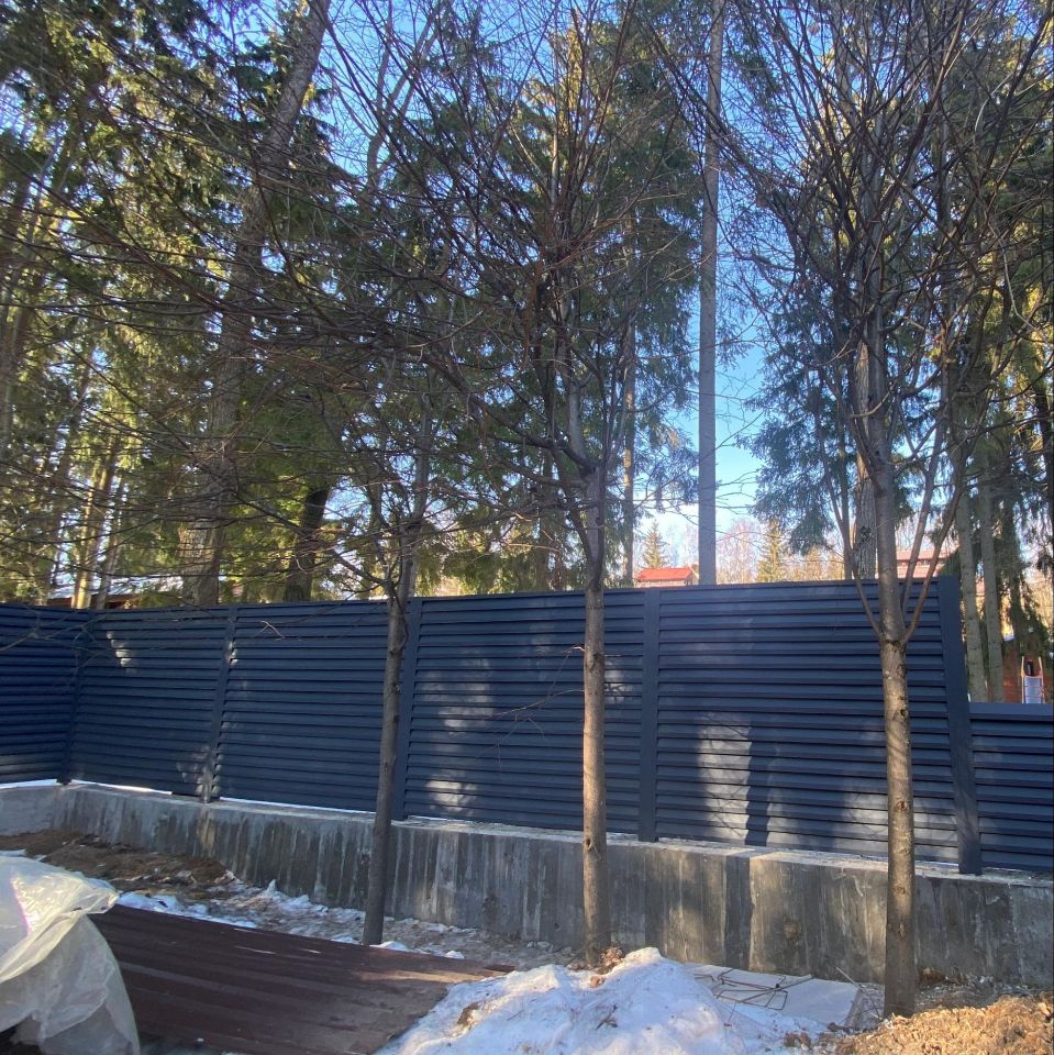 Перед заливкой бетоном мы установили в опалубке ростверка металлические направляющие, на которые впоследствии смонтировали самонесущий профиль Grand Line Tokyo в цвете «мокрый асфальт». Ламели Tokyo выполнены из оцинкованной стали с полимерным покрытием и одинаково красиво смотрятся с обеих сторон. Такой забор устойчив к ветровым нагрузкам, легко монтируется без сварки и имеет гарантию от производителя — до 50 лет.