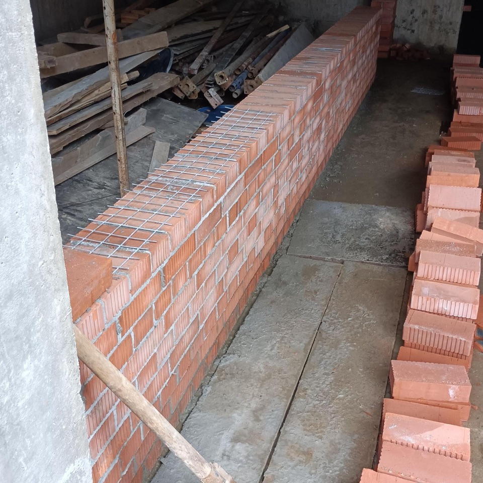 Работы по основному дому продолжились с кладки стен 2-го этажа из крупноформатных керамических блоков Porotherm Wienerberger. Мы кладем их на теплоизоляционный раствор Perfekta Линкер-Термо, усиливая базальтовой сеткой. Параллельно идет кладка лифтовой шахты, стен и перегородок в подвале, а также на 2-м этаже. Здесь мы используем красный полнотелый кирпич Каширского завода и универсальную смесь Perfekta М-150.