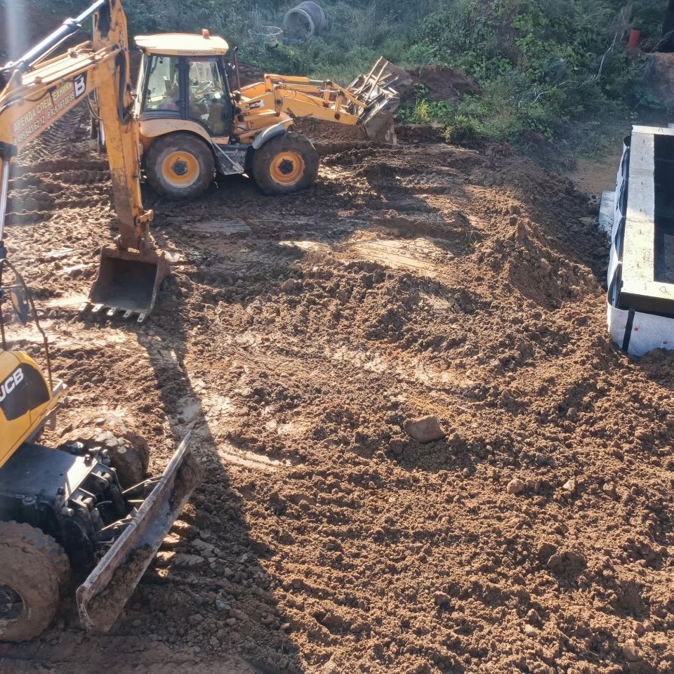 Завершающий этап — обратная засыпка пазух грунтом. Основную работу мы выполнили с помощью экскаватора и погрузчика, остальное доработали вручную. Это делается, чтобы уплотнить основание, обеспечить стойкость и прочность фундамента.