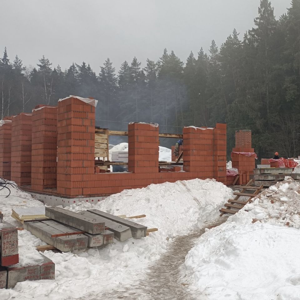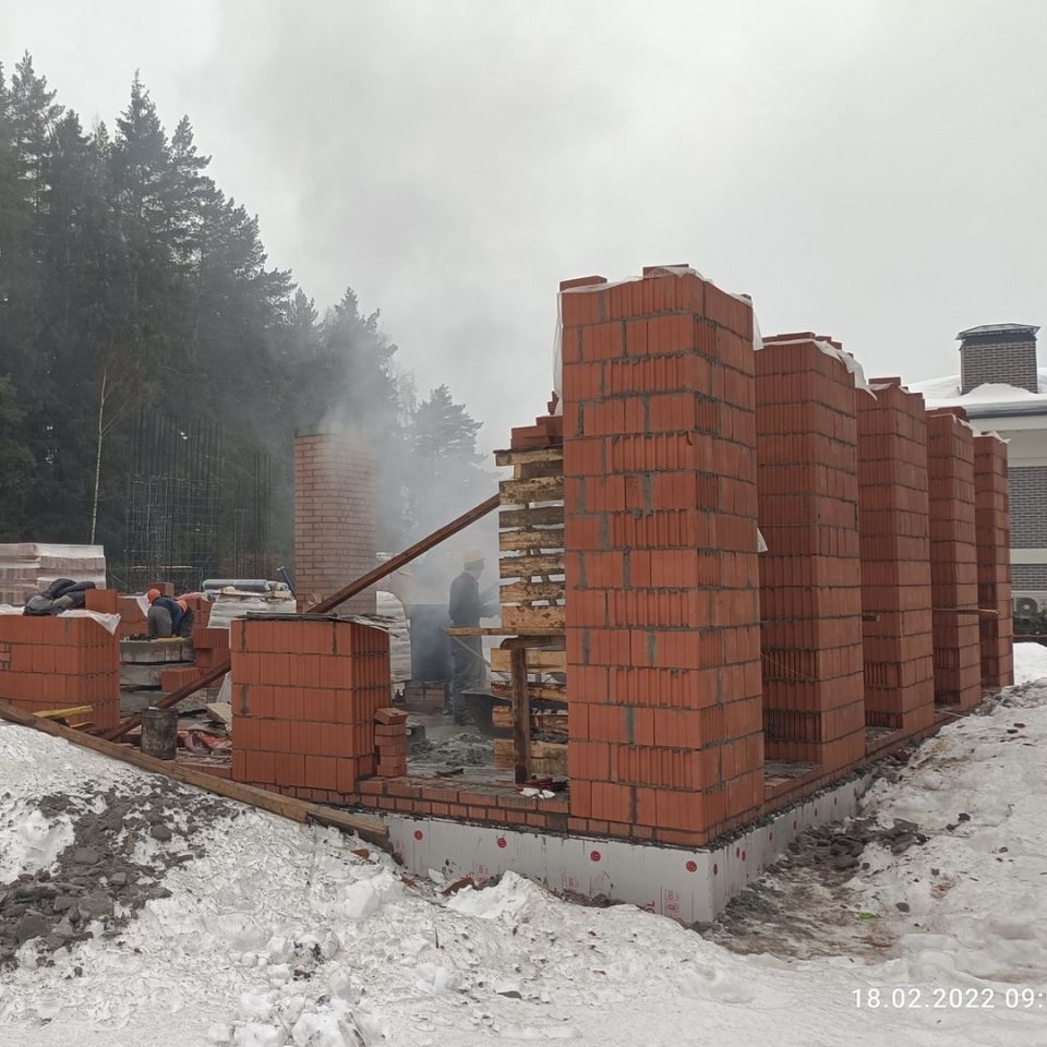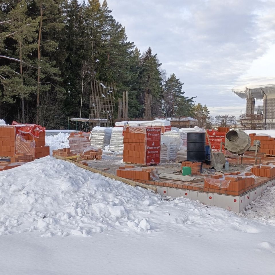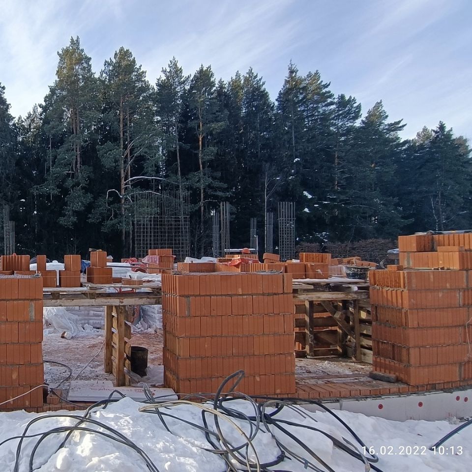 Выше подвального перекрытия мы продолжаем армирование вертикальных конструкций, а также приступили к кладке стен и перегородок первого этажа. По проекту наружные стены будут из крупноформатных керамических блоков Wienerberger Porotherm. По сравнению с другими стеновыми материалами теплопроводность у них ниже, а уровень звукоизоляции выше. Блоки кладем на теплоизоляционный раствор «Perfekta» Линкер Термо. Он обеспечивает прочную однородную кладку и способствует снижению теплопотерь через кладочный шов. Перегородки на первом этаже возводим из красного полнотелого кирпича М150 «Каширского кирпичного завода».