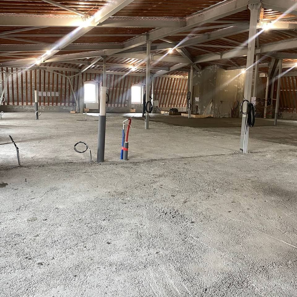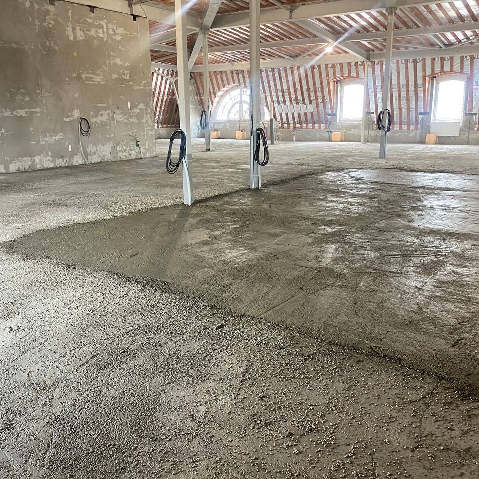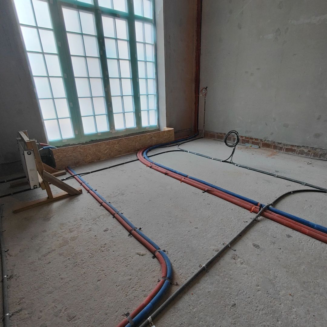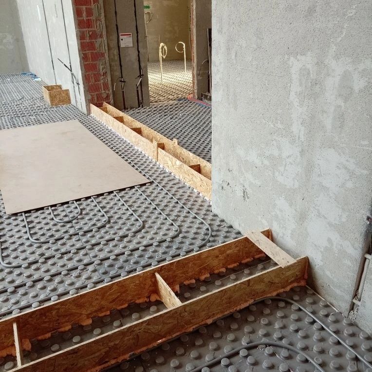 Сейчас на объекте одновременно ведутся работы на разных участках и в разных домах комплекса. В доме персонала выполняется устройство и отделка оконных откосов, включая монтаж защитных и армирующих слоев, установку профилей и штукатурные работы с подготовкой поверхностей под дальнейшую отделку. В основных домах продолжается устройство стяжек пола — как полусухих, так и полистиролбетонных. Параллельно ведется подготовка оснований, уход за набирающими прочность слоями и защита конструкций в процессе технологического цикла. На отдельных этажах выполняется монтаж опалубки в проемах под стеклянные ограждения и двери, а также подготовка зон под внутрипольные конвекторы.