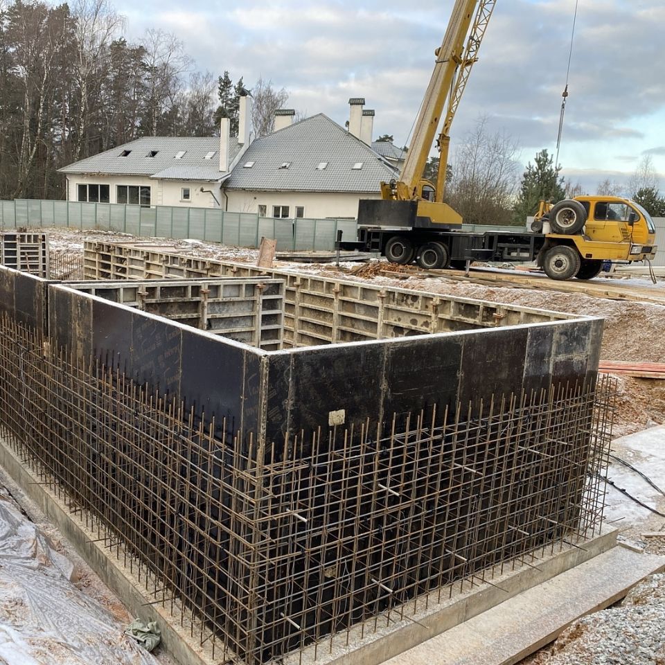 Когда арматурный каркас был готов, мы собрали опалубку и приступили к заливке фундамента бетоном М350 «Инком-Бетон». Он имеет высокий показатель подвижности П3/П4 и легко распределяется внутри опалубки под собственным весом, заполняя все пустоты.