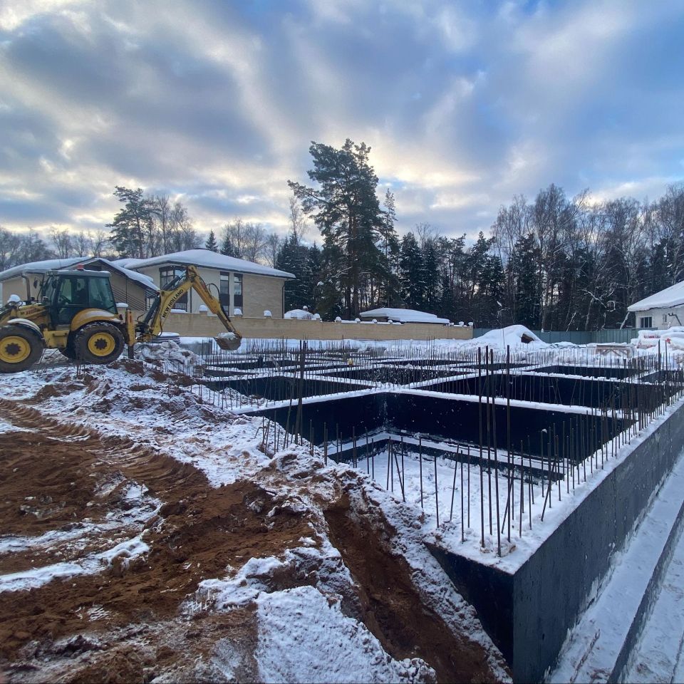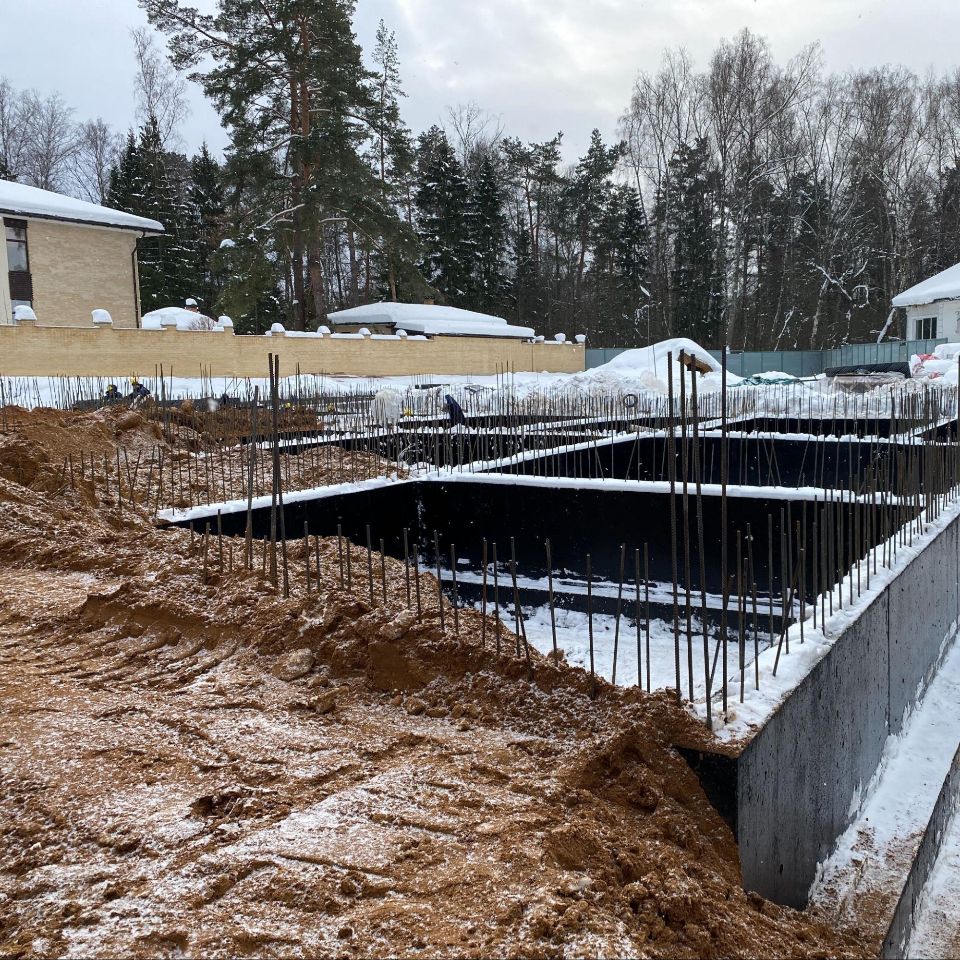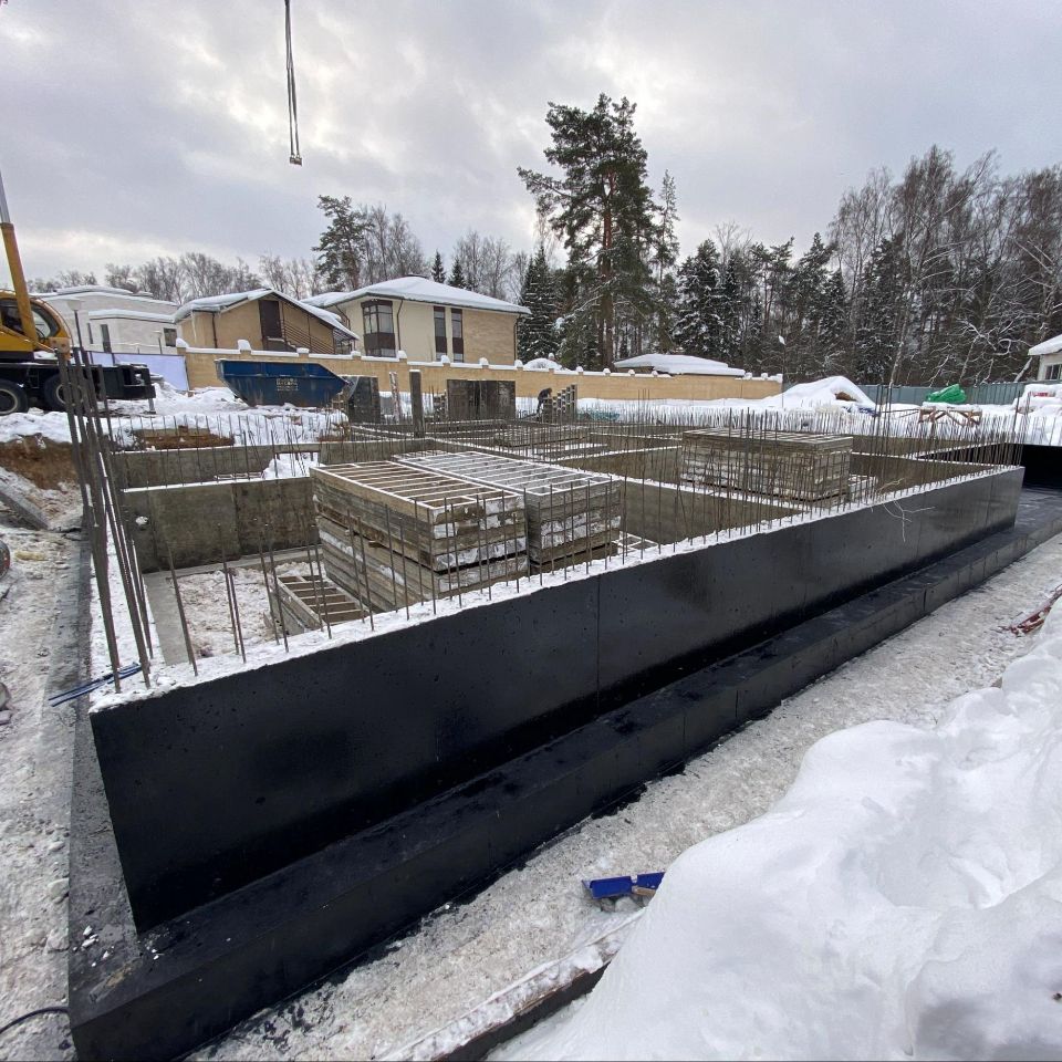 Когда бетон набрал нужную прочность, мы демонтировали опалубку и начали обмазочную гидроизоляцию фундамента и стен подвала материалами Технониколь. На этом этапе мы используем мастику №24, которая образует жесткую влагозащитную мембрану и служит праймером перед наплавлением рулонной гидроизоляции Техноэласт.