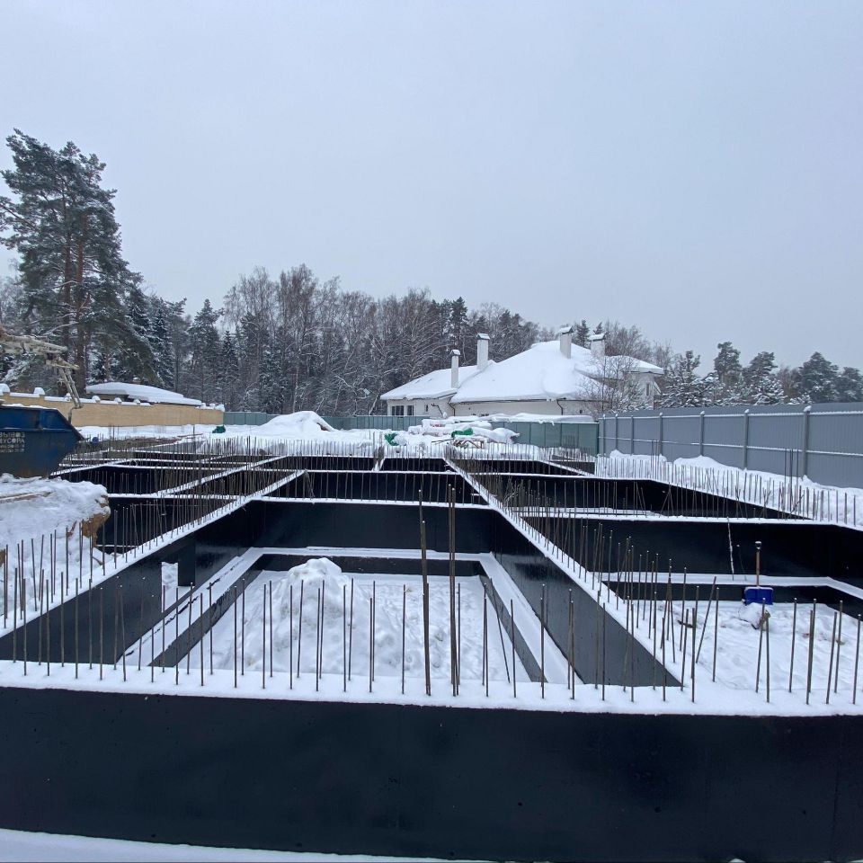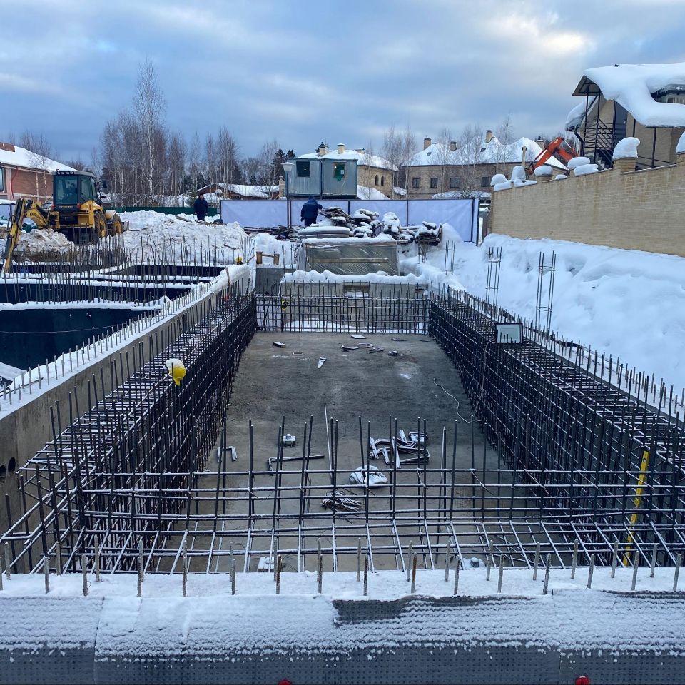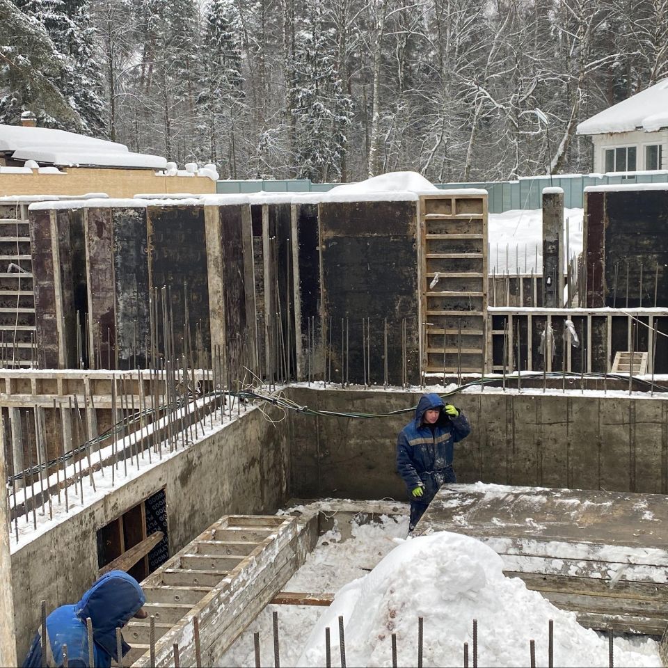 Работы по основному дому начались с заливки стен подвала бетонным раствором с высокой маркой прочности и хорошей подвижностью П3/П4. С помощью автобетононасоса такая смесь распределяется внутри опалубки быстро и без пустот. А чтобы бетон набрал необходимую прочность без образования трещин, мы периодечски прогревали его до 15°C.