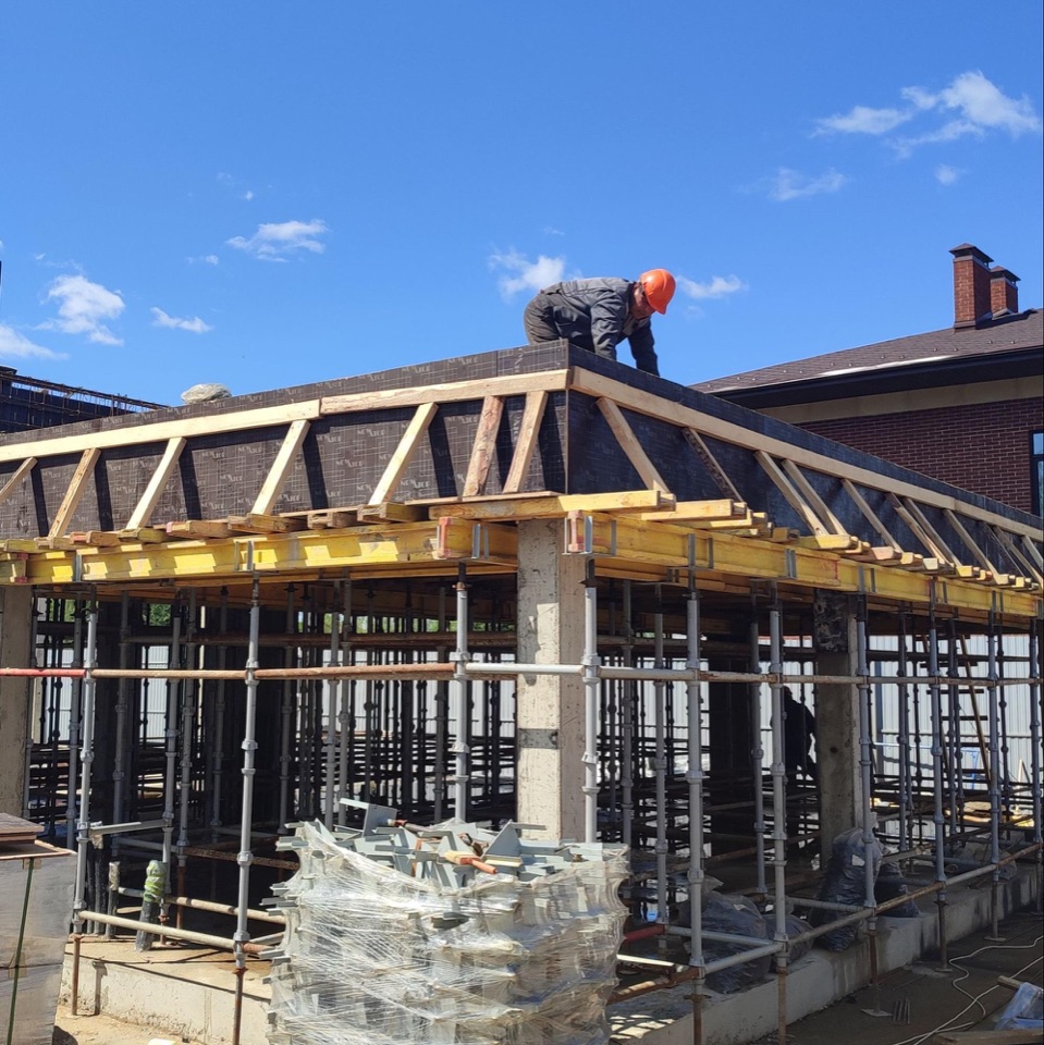 Сейчас на объекте продолжается устройство опалубки под монолитное перекрытие 1-го этажа.