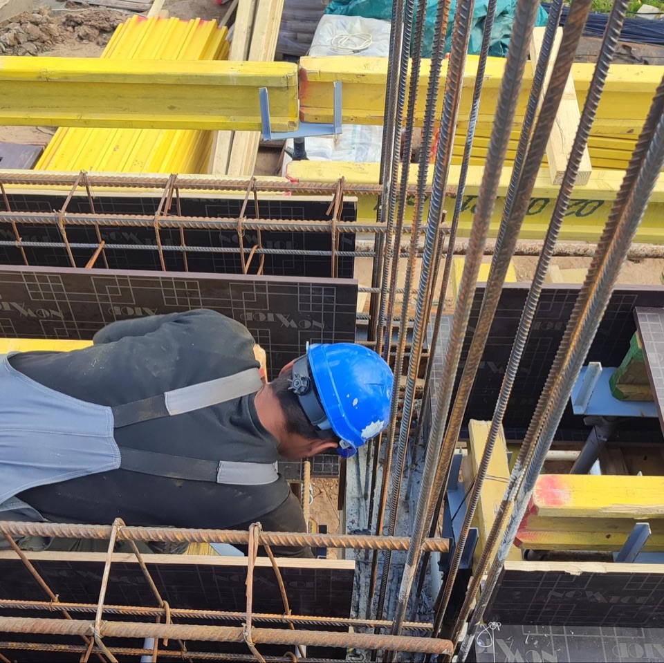 Параллельно шла подготовка опалубки под монолитные бетонные балки перекрытия. У них хорошая прочность, но для достижения нормативных показателей их нужно армировать. Чтобы создать прочный каркас мы использовали несколько видов сертифицированных арматурных прутьев класса АI и АIII. У арматуры класса АI гладкий профиль и высокая коррозийная стойкость, но недостаточно хорошее сцепление с бетоном. Это компенсируется использованием рифленого профиля класса АIII. Его периодические ребра обеспечивают усиленное сцепление с раствором, что существенно повышает устойчивость несущего каркаса.