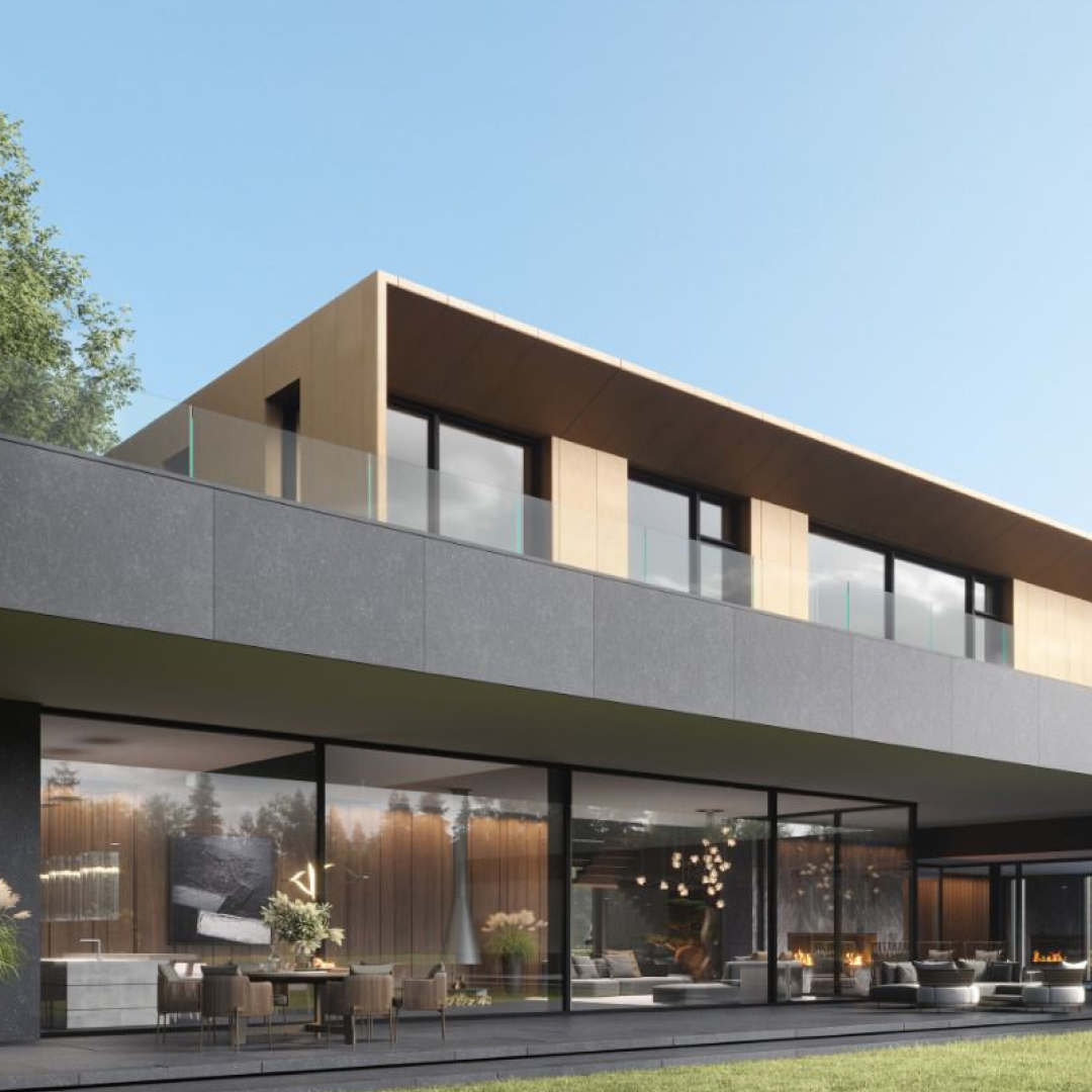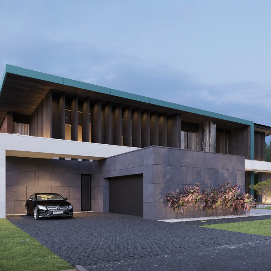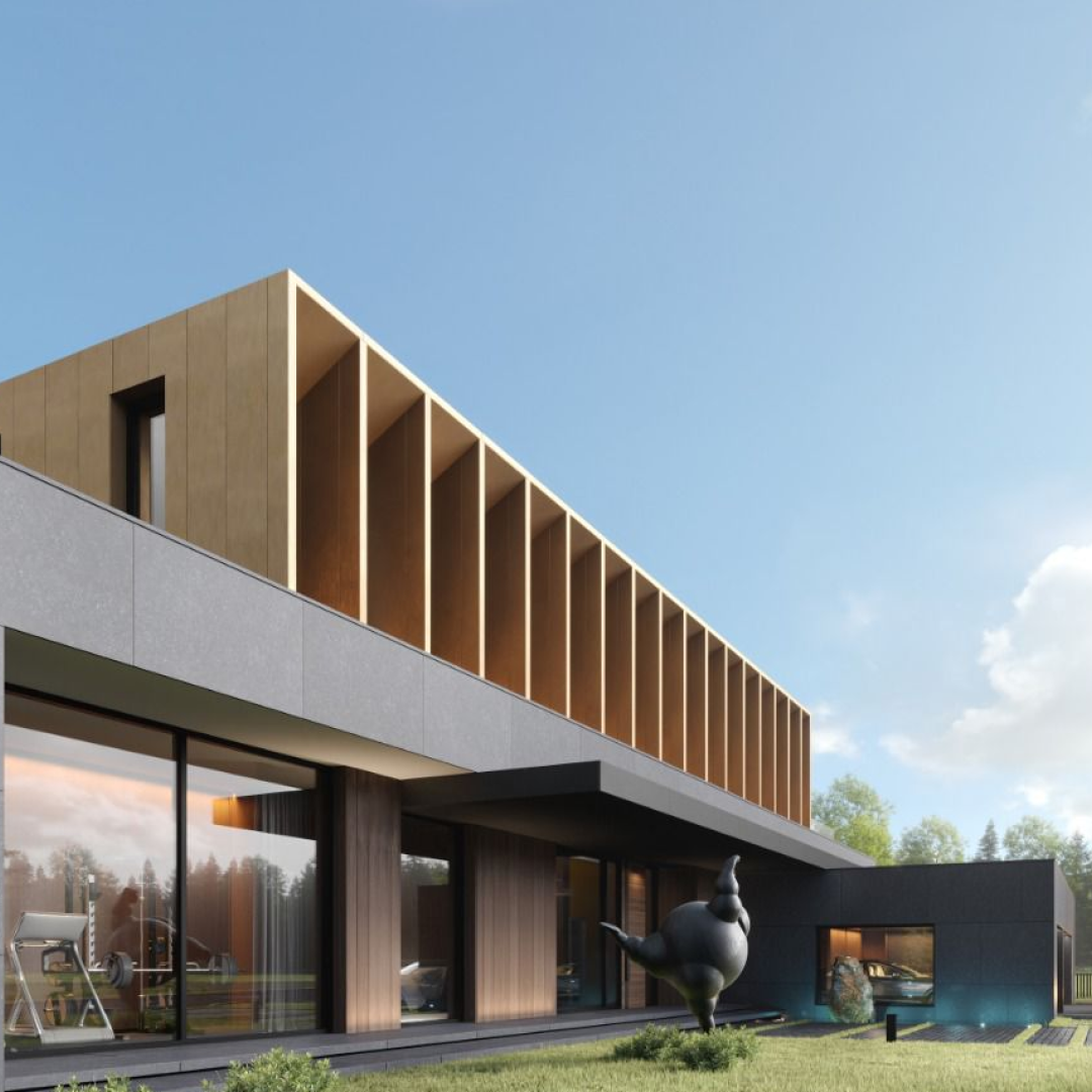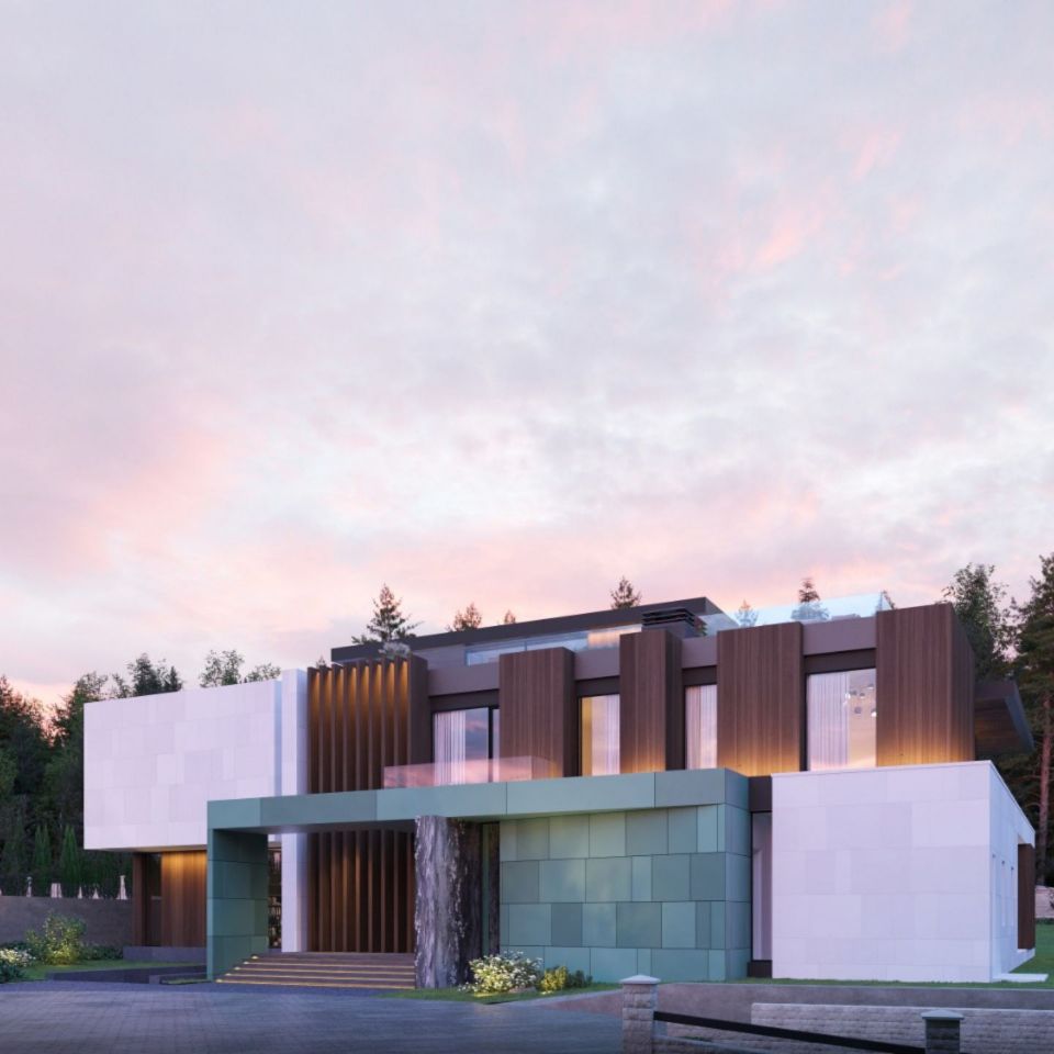 На площади 950 кв.м. разместилось 3 террасы, гараж на 3 автомобиля и крытый бассейн. На сегодняшний день мы приступаем к облицовке фасада деревянным планкеном и крупноформатным керамогранитом Arch-Skin.