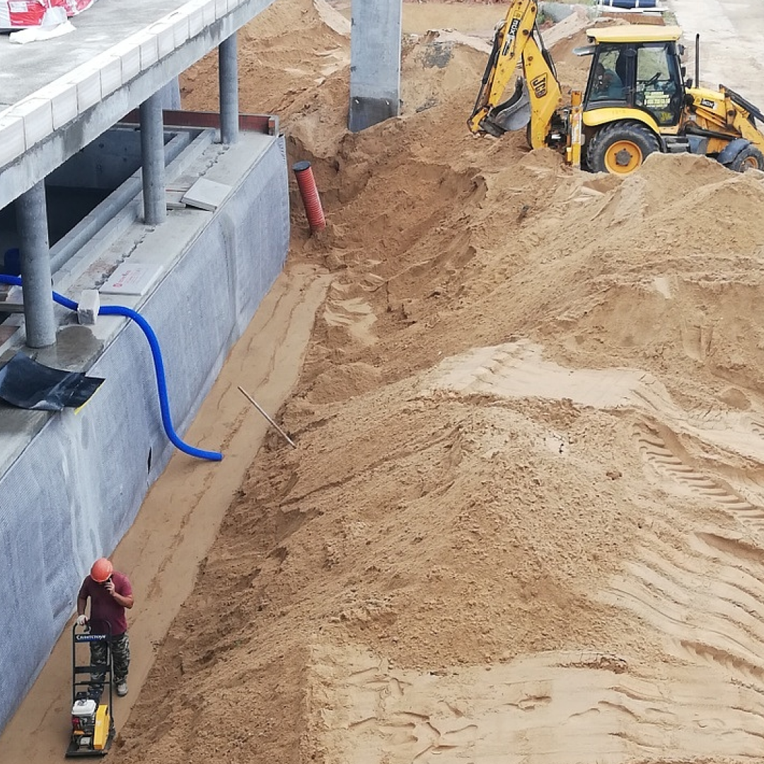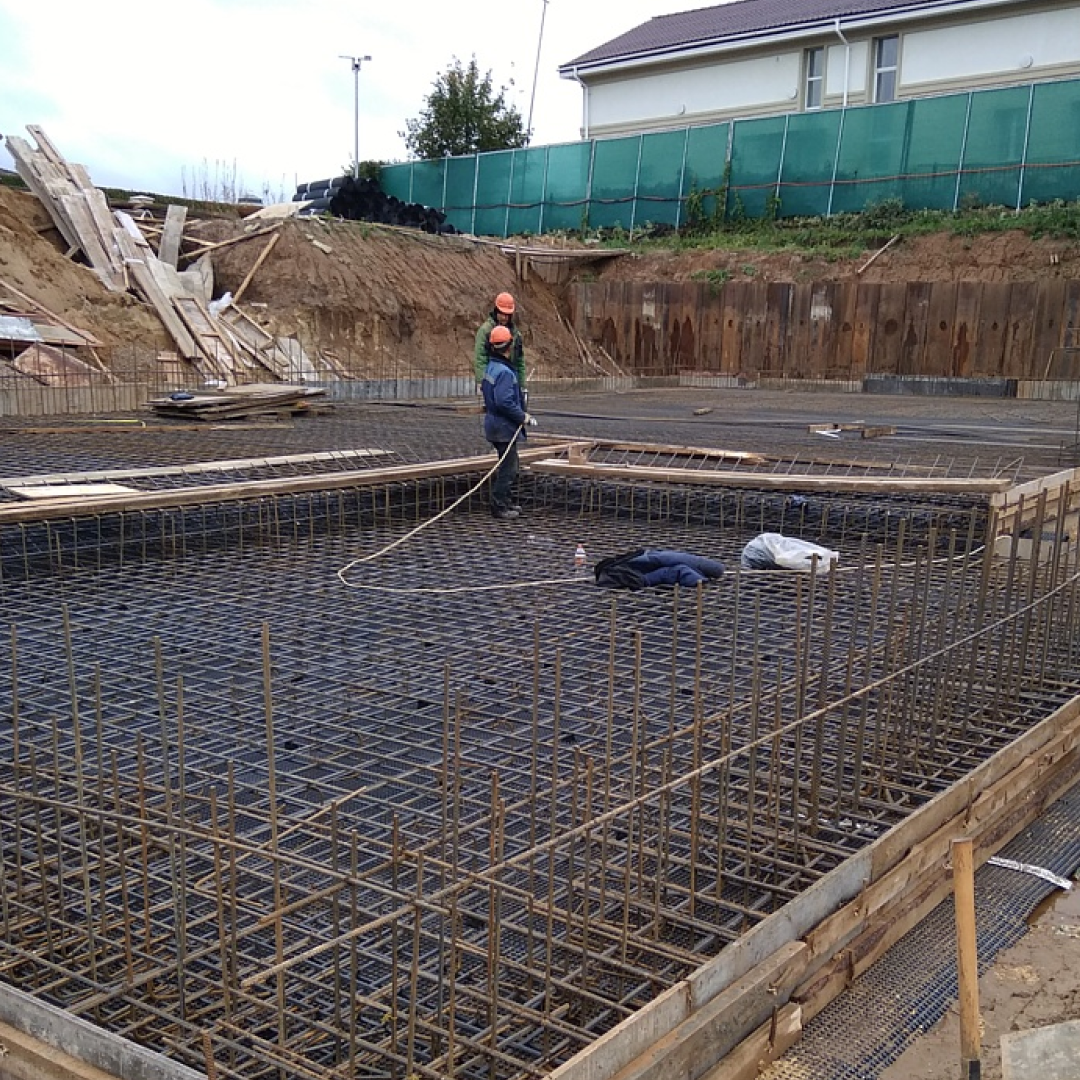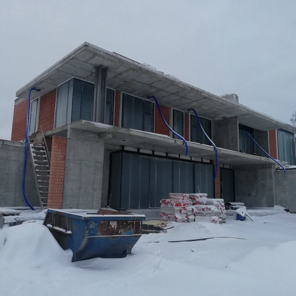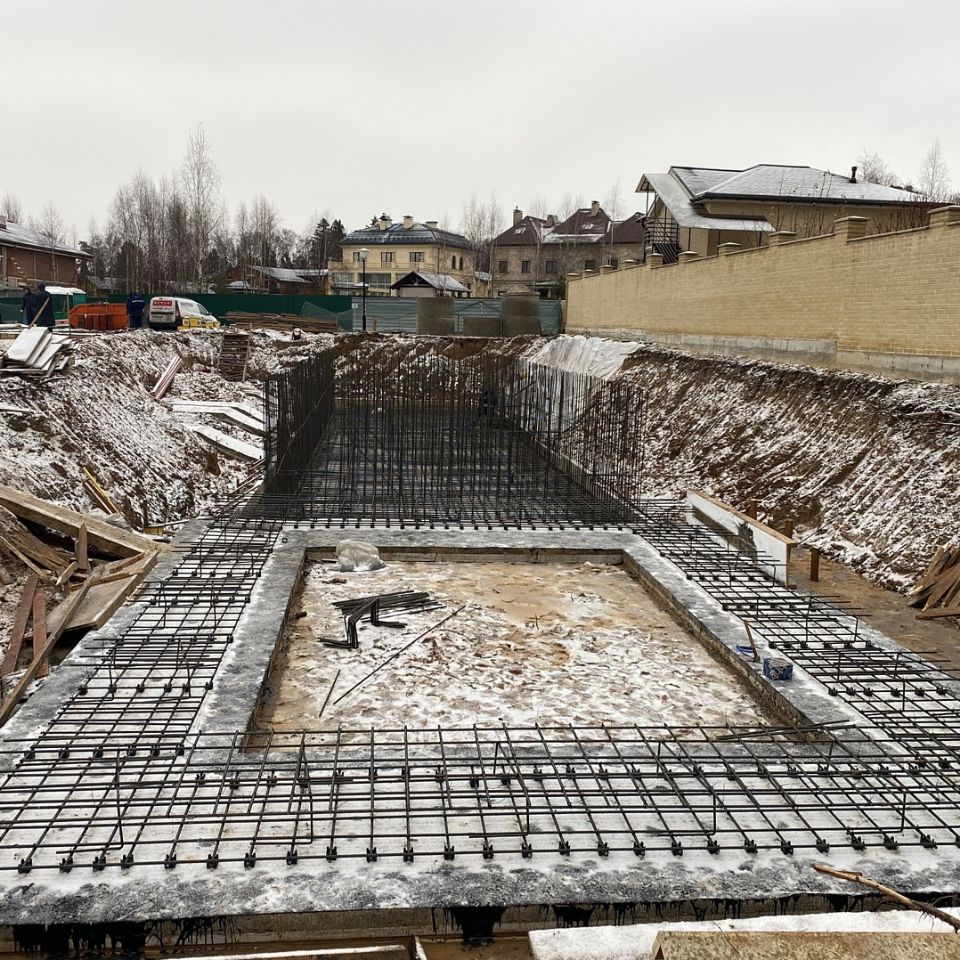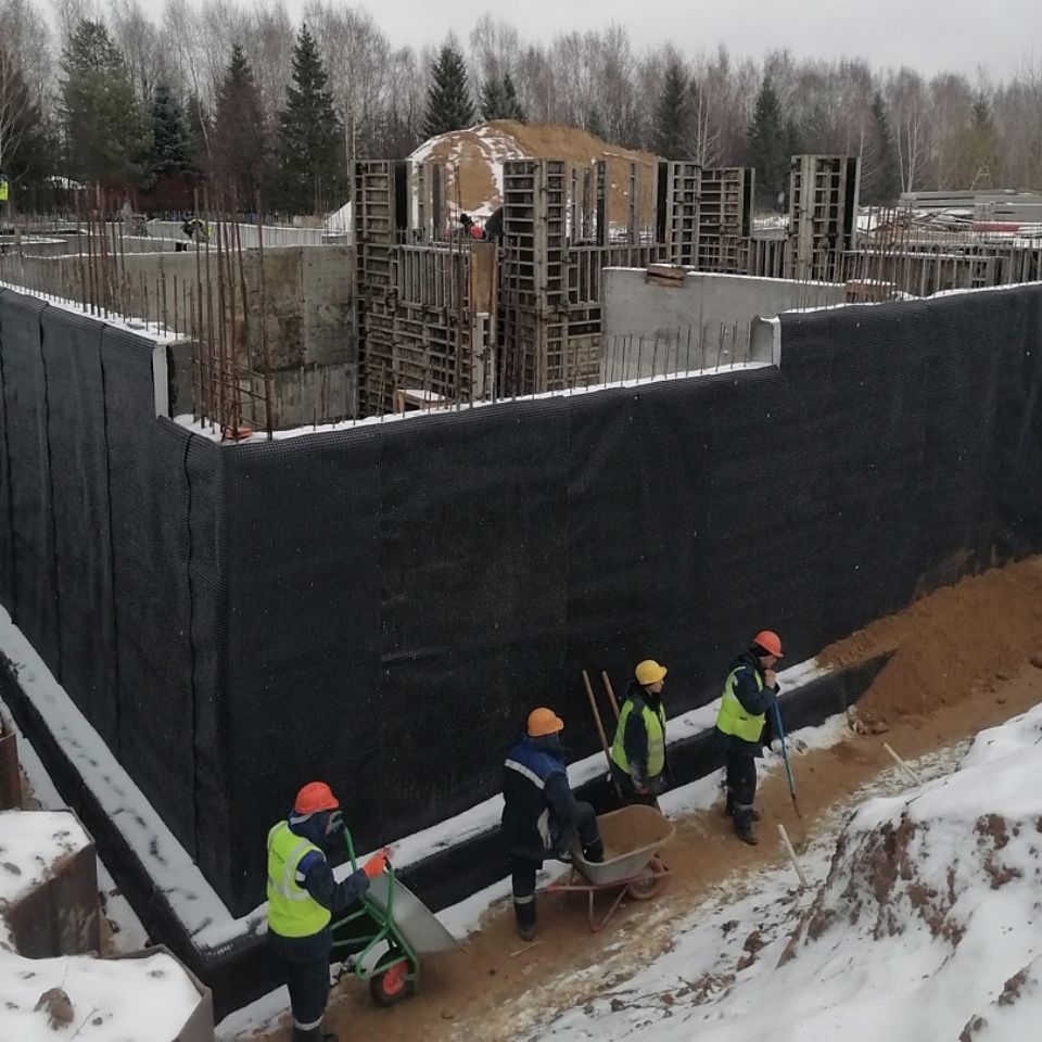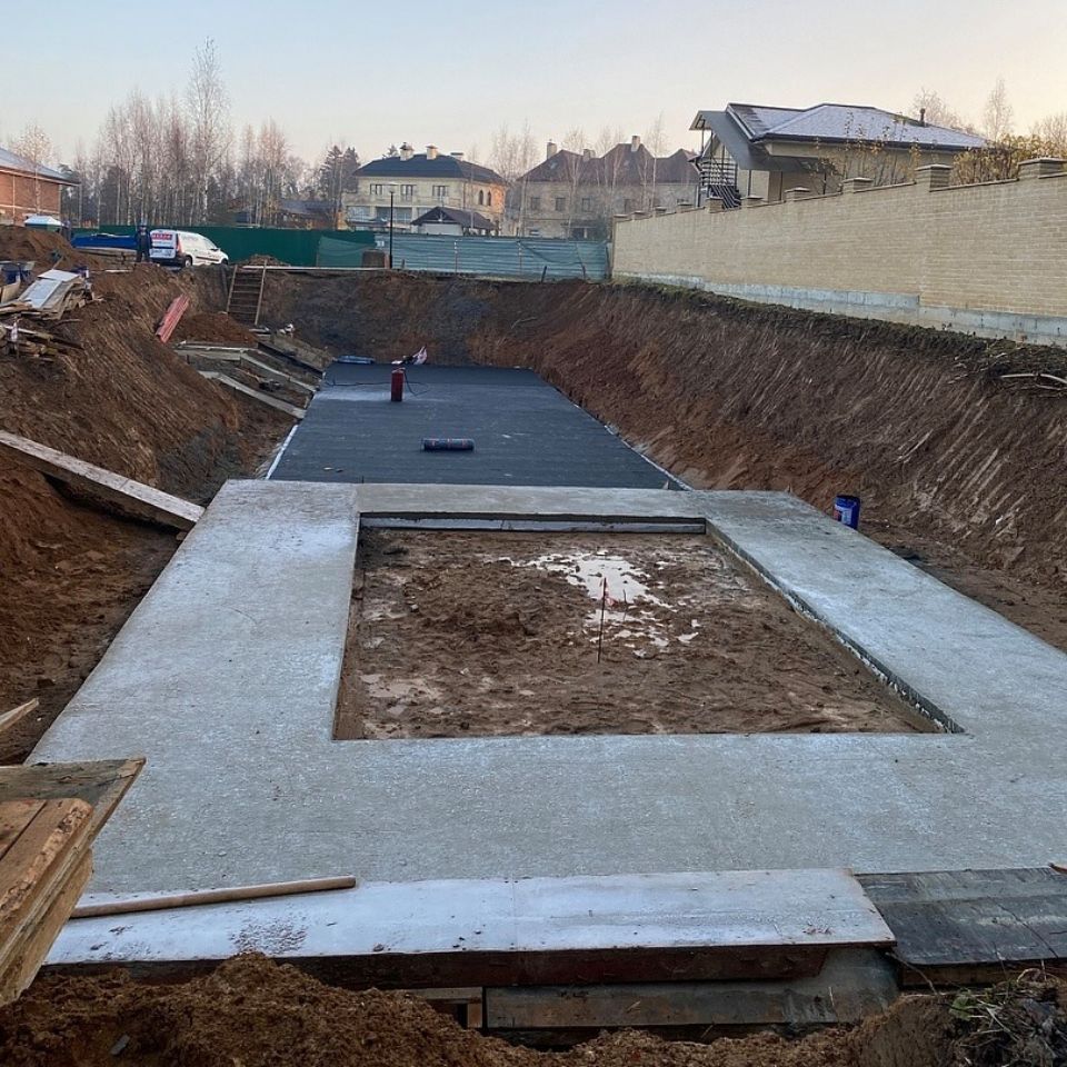 Архитекторы разместили на территории 1204 кв.м. бассейн, летнюю кухню, гараж, спортзал и две террасы. Сейчас мы заканчиваем устройство гидроизоляции стен подвала и цоколя материалами Технониколь.