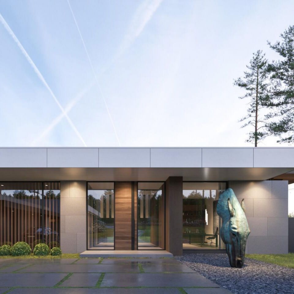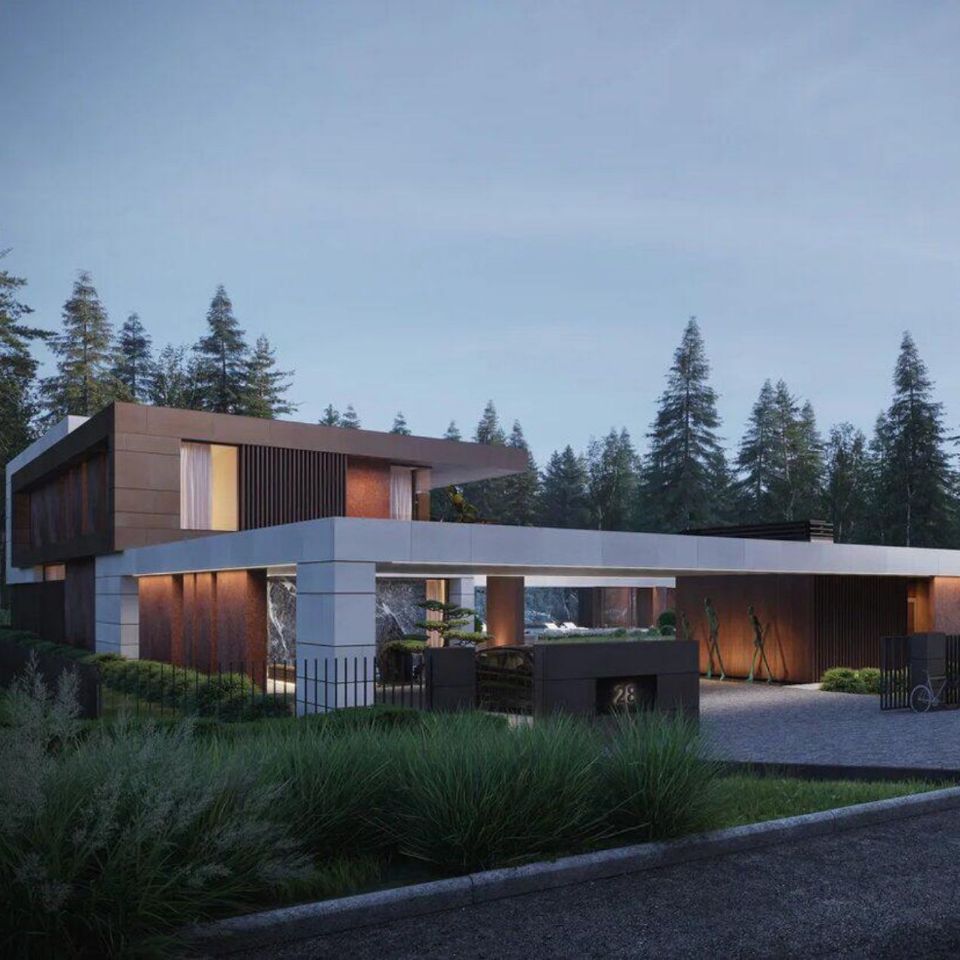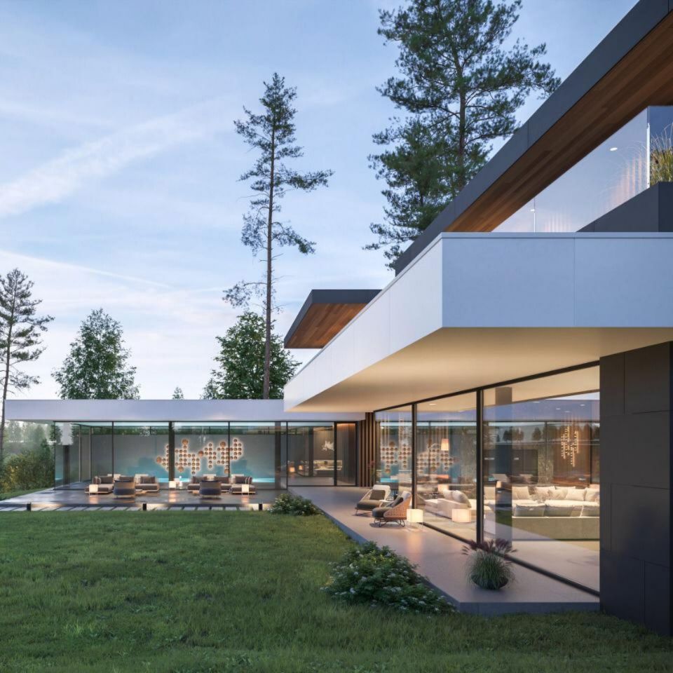 Современная постройка с цокольным этажом и зоной отдыха на эксплуатируемой кровле, окруженная сосновым лесом. Площадь застройки — 1399 кв.м.
